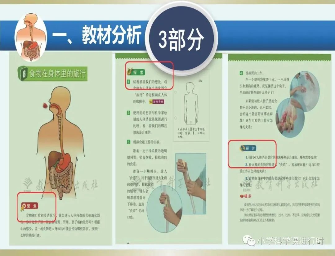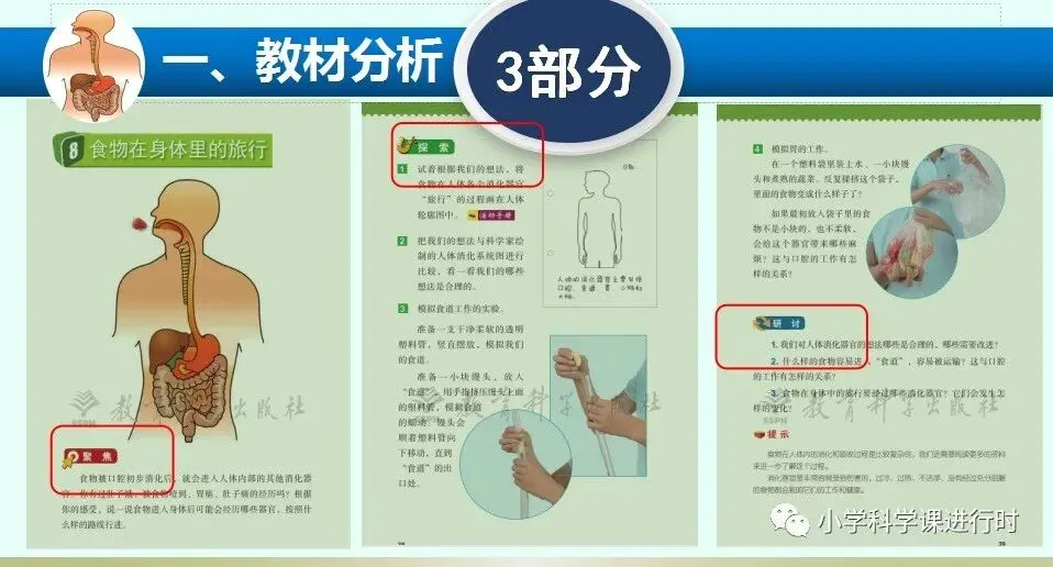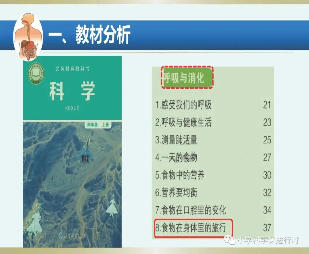《食物在身体里的旅行》是教科版小学科学四年级上册《呼吸与消化》单元的第8课。本课主要在学生对原有消化知识理解的基础上,通过比对消化器官图和模拟实验,进一步认识食物在身体内的消化过程及各主要消化器官的功能,进而能够明白食物的消化需要多个器官共同参与完成。