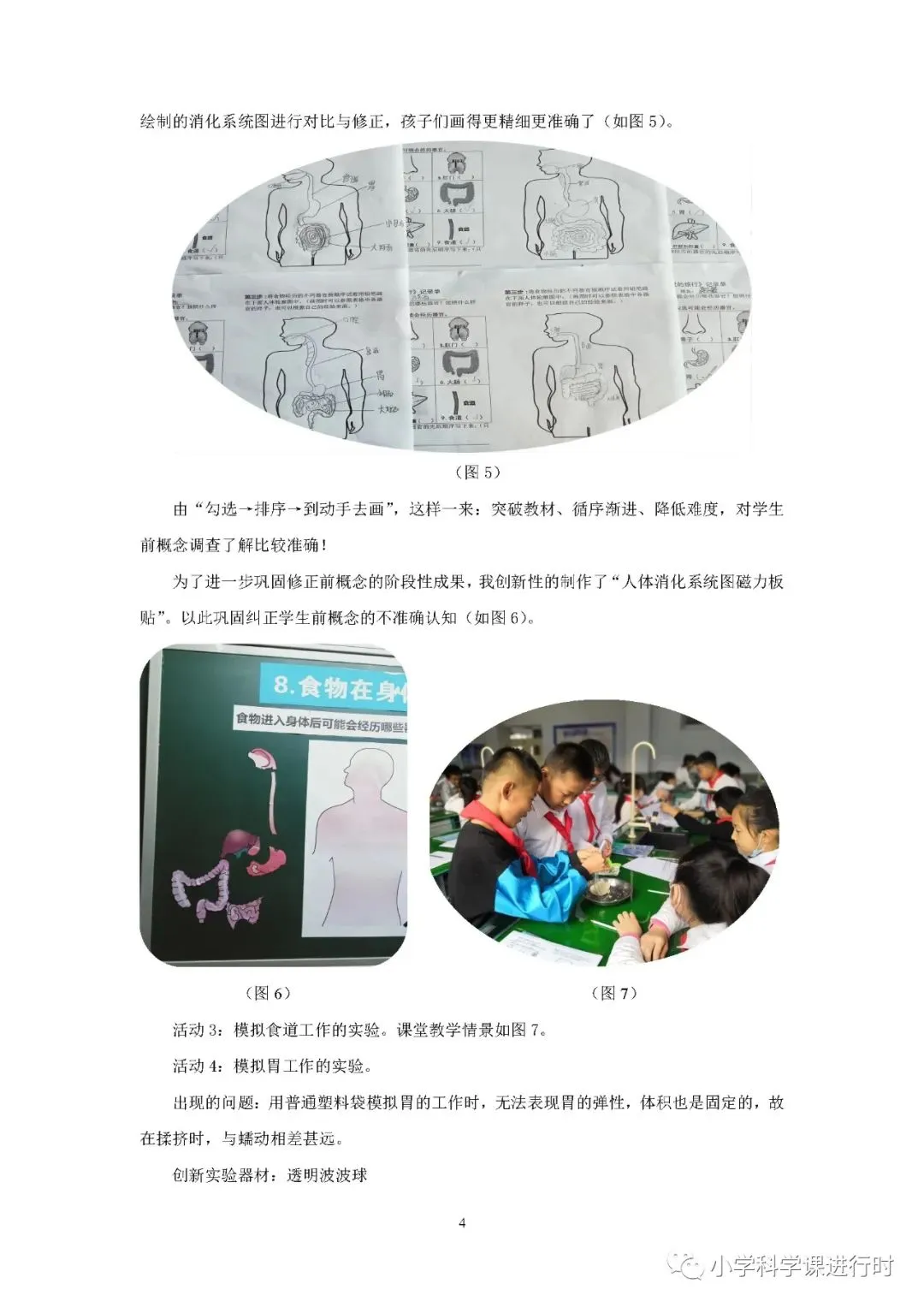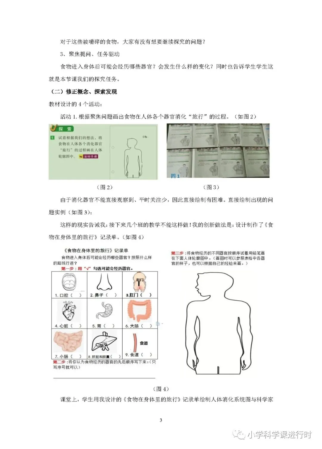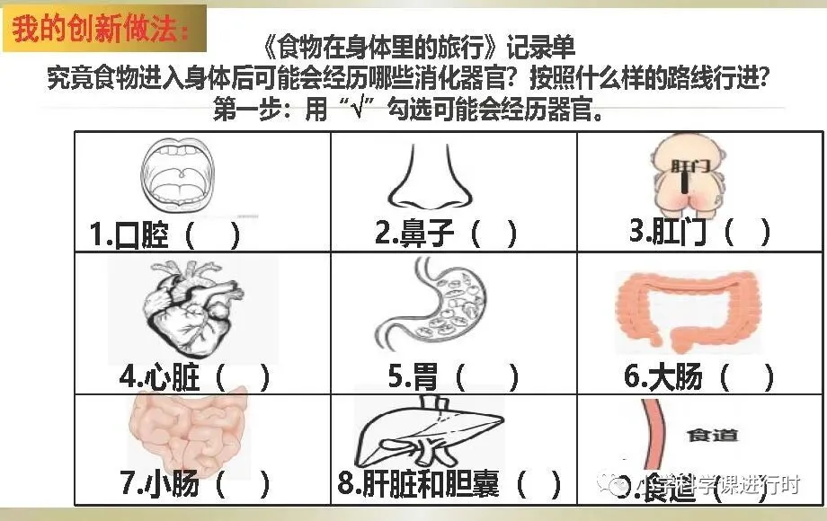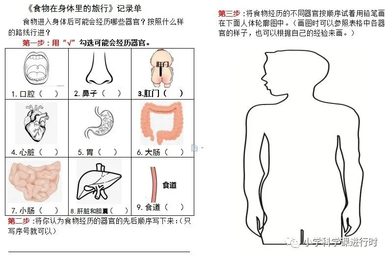 这样的现实告诫我:接下来几个班的教学不能这样做!我的创新做法是:设计制作了《食物在身体里的旅行》记录单。(如图4)