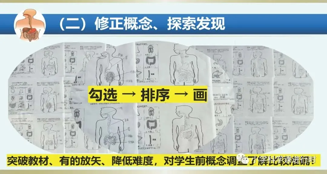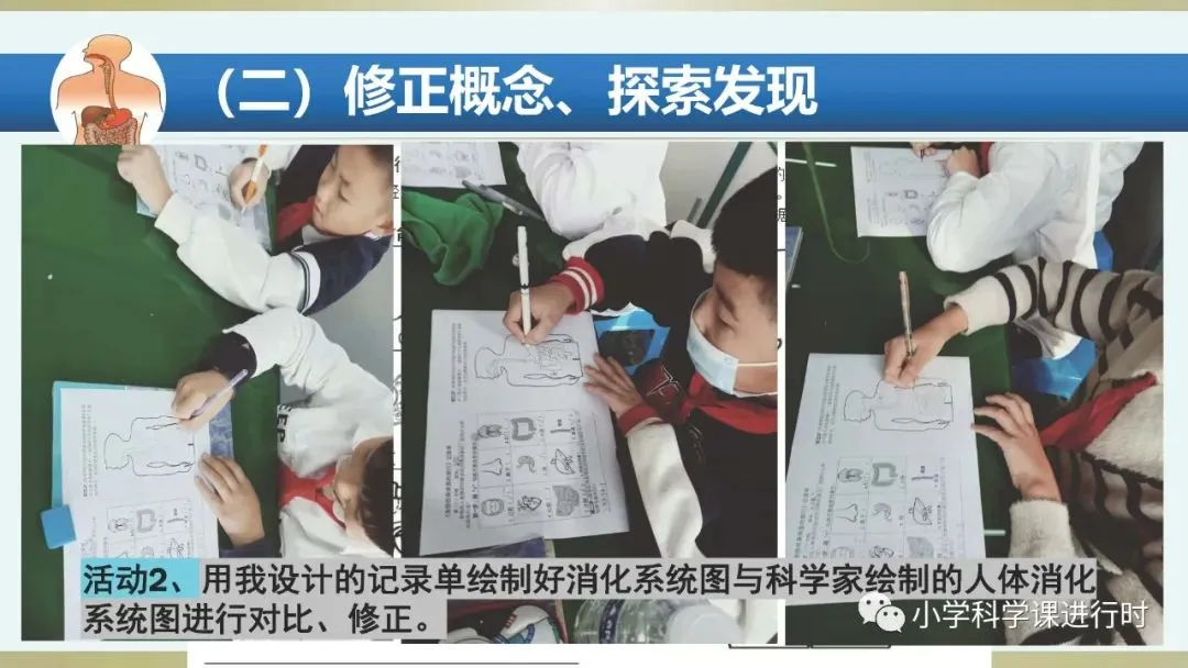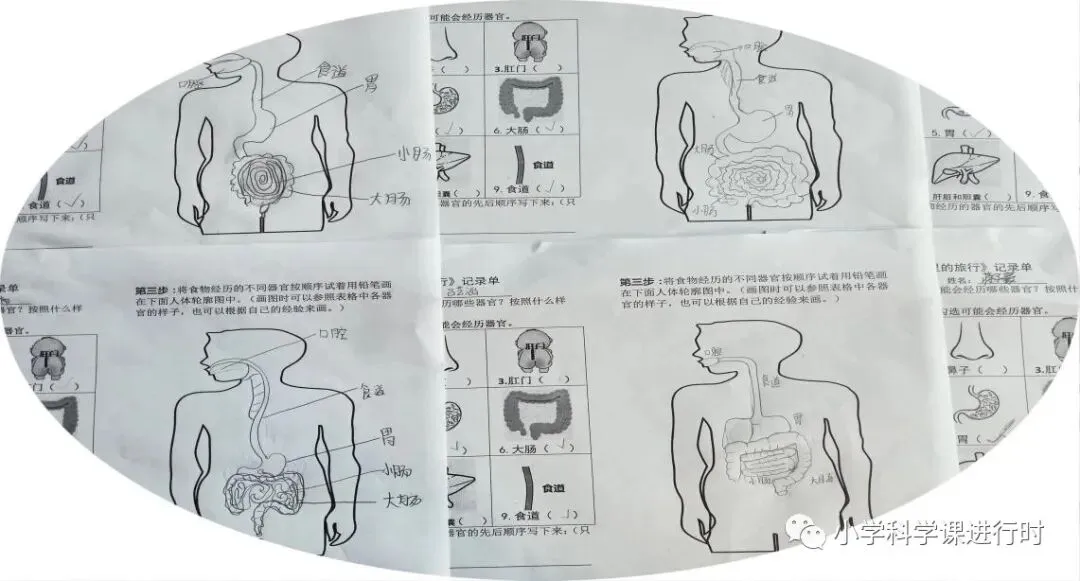 重新设计《食物在身体里的旅行》记录单,突破教材、化难为易,让学生更加准确的绘制出了人体消化系统图。