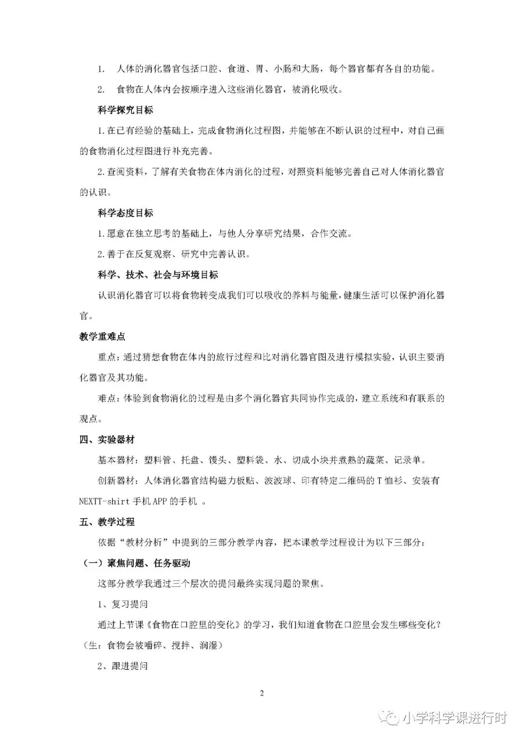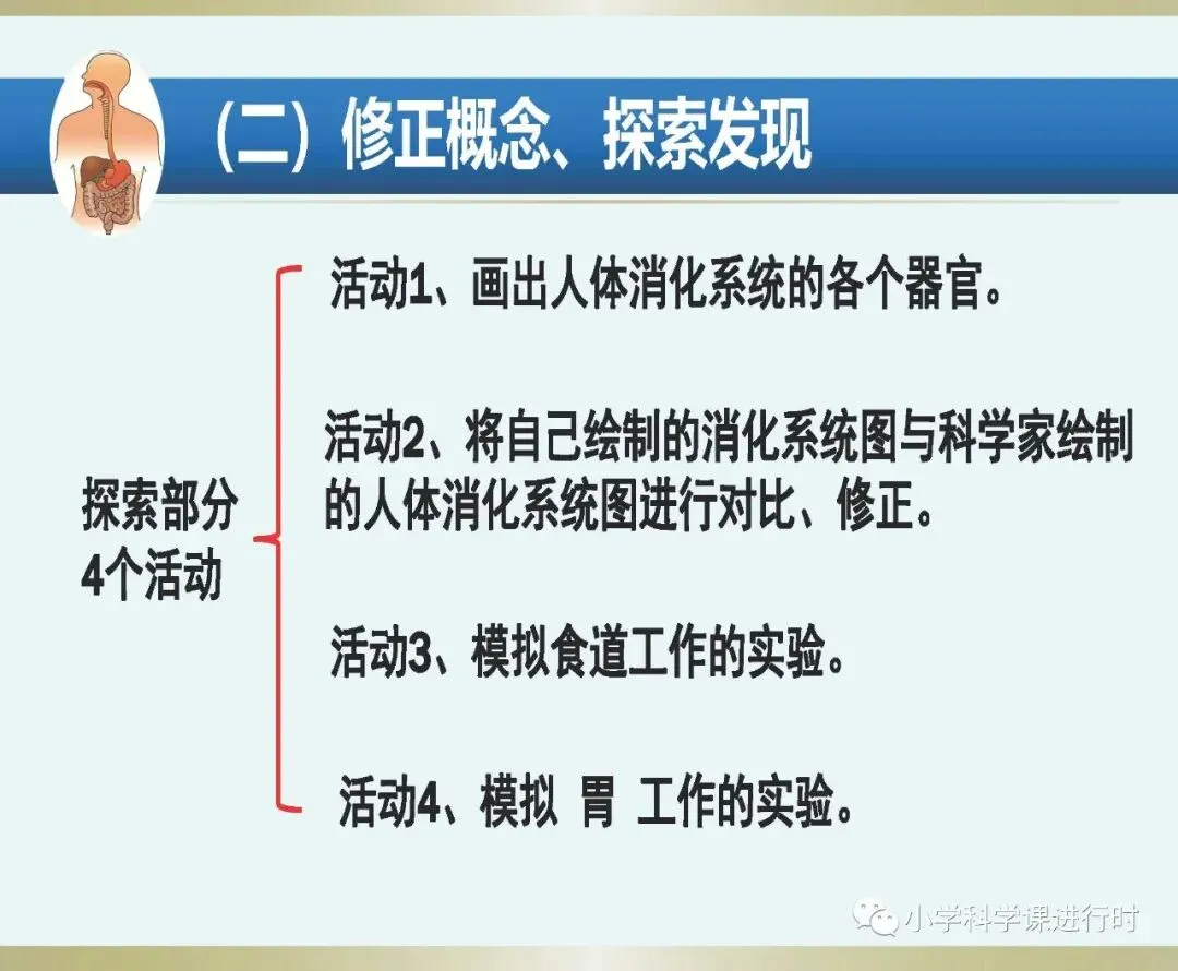 重点:通过猜想食物在体内的旅行过程和比对消化器官图及进行模拟实验,认识主要消化器官及其功能。
