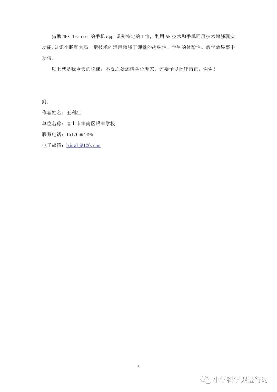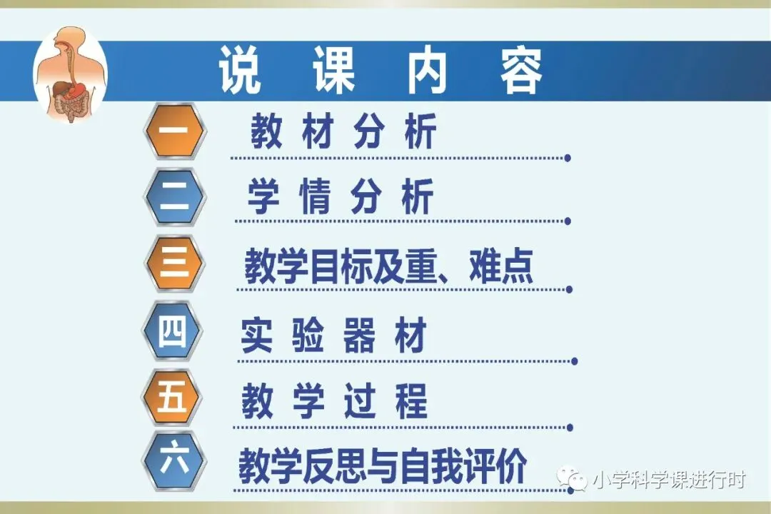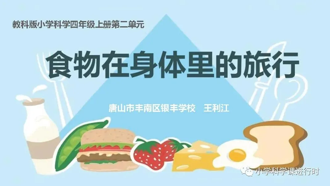 你们好!我是来自唐山市丰南区银丰学校的科学教师王利江。今天,我要说课的题目是《食物在身体里的旅行》,接下来我将从六个方面进行说课:教材分析、学情分析、教学目标及重难点、实验器材、教学过程、教学反思和自我评价。