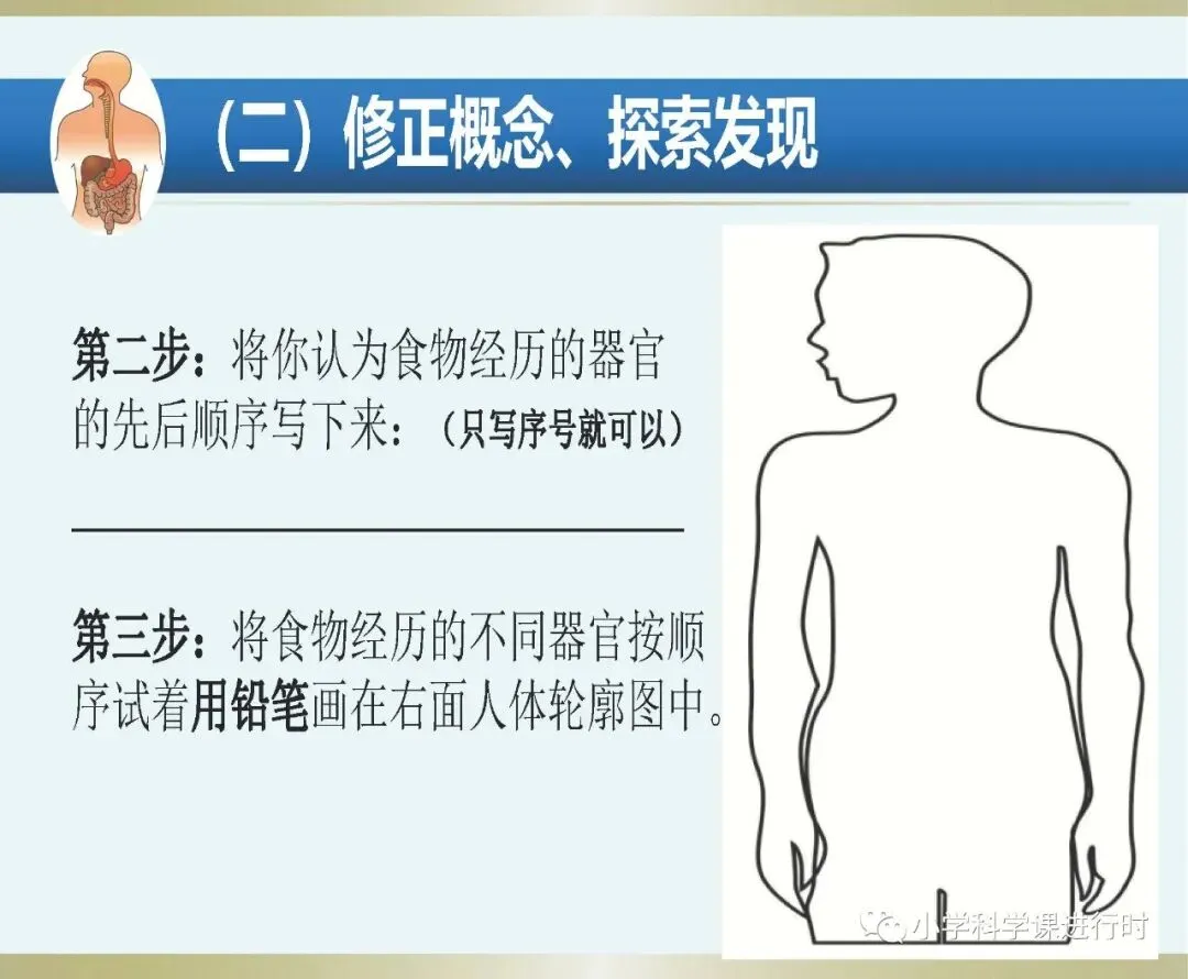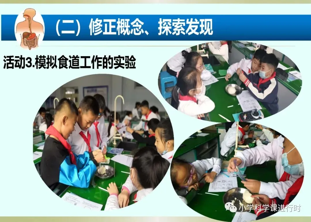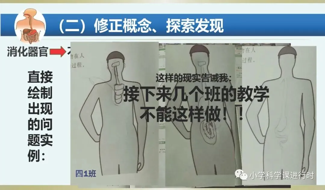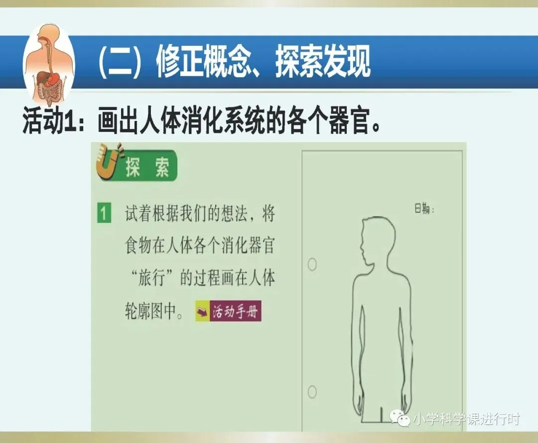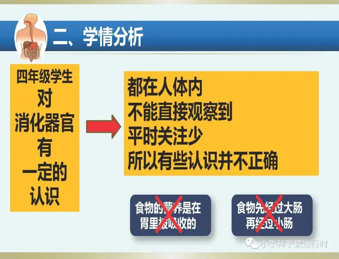 四年级的学生已经对消化器官有了一定的认识。可是,因为这些器官都在人体内,不能直接观察到,平时也很少关注,所以学生有些认识并不正确,如:有些同学认为食物的营养是在胃里被吸收的,食物先经过小肠再经过大肠,这些认识都是错误的。