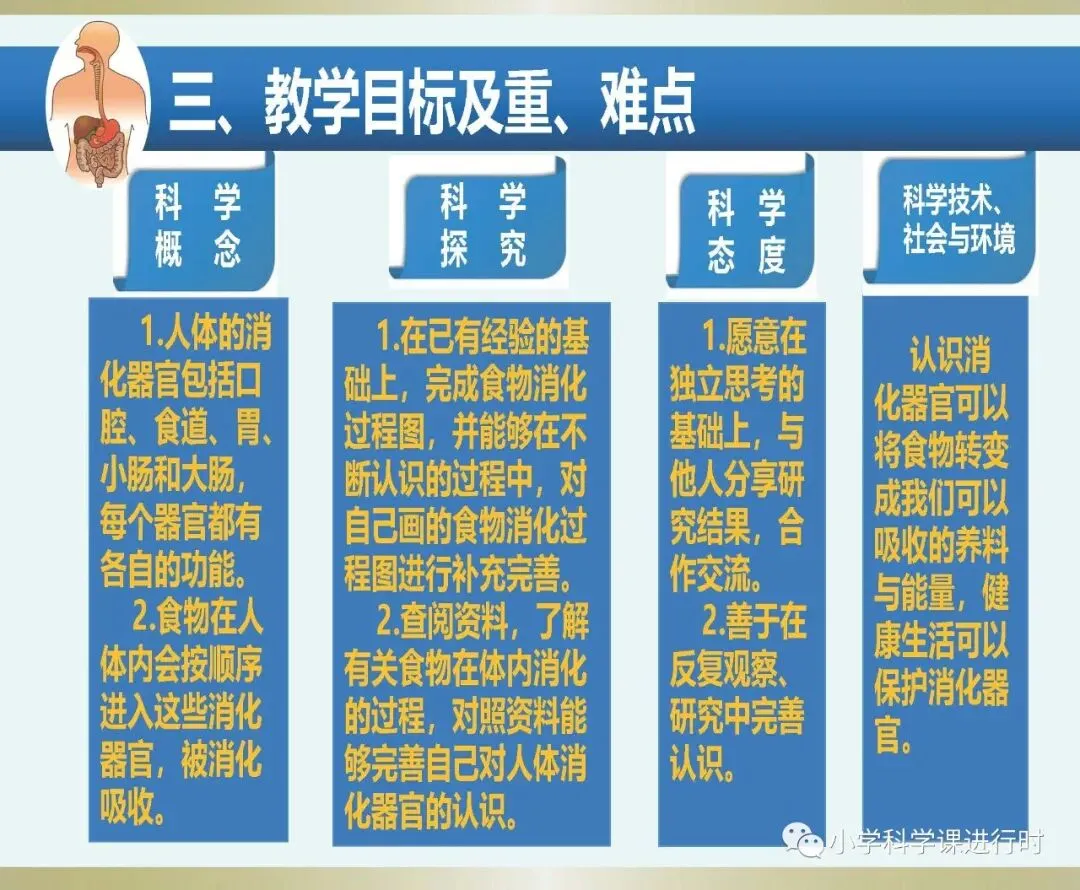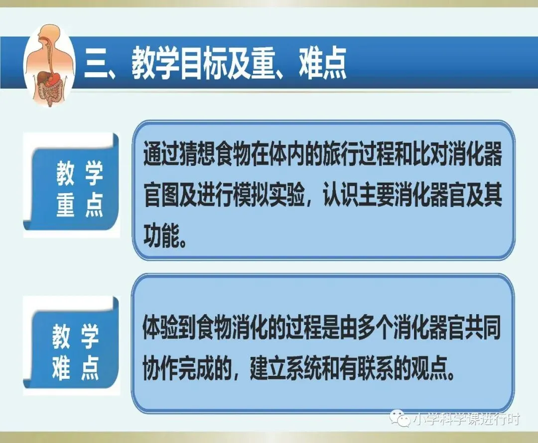 难点:体验到食物消化的过程是由多个消化器官共同协作完成的,建立系统和有联系的观点。
