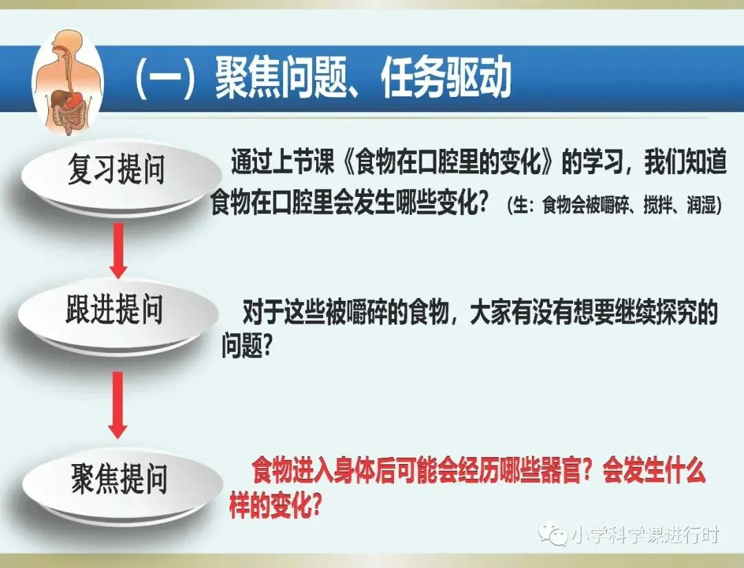 食物进入身体后可能会经历哪些器官?会发生什么样的变化?同时也告诉学生学生这就是本节课我们的探究任务。