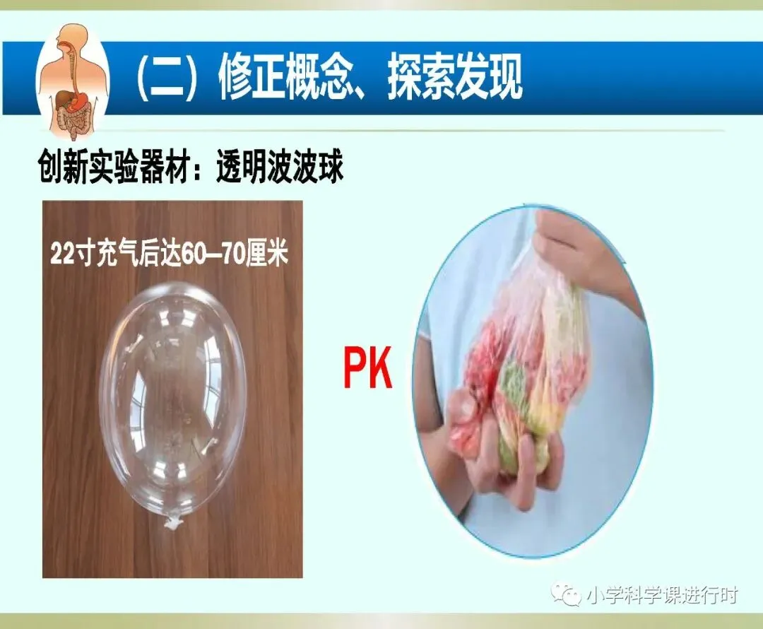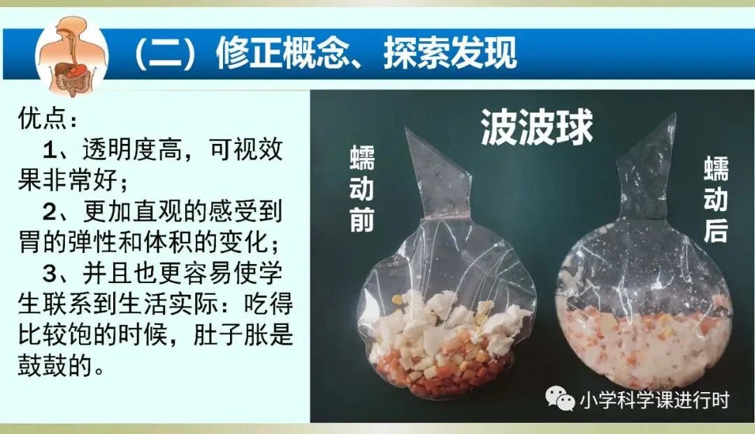 2、运用波波球清晰比较消化前后食物的样子、较真切的体验胃的蠕动过程。