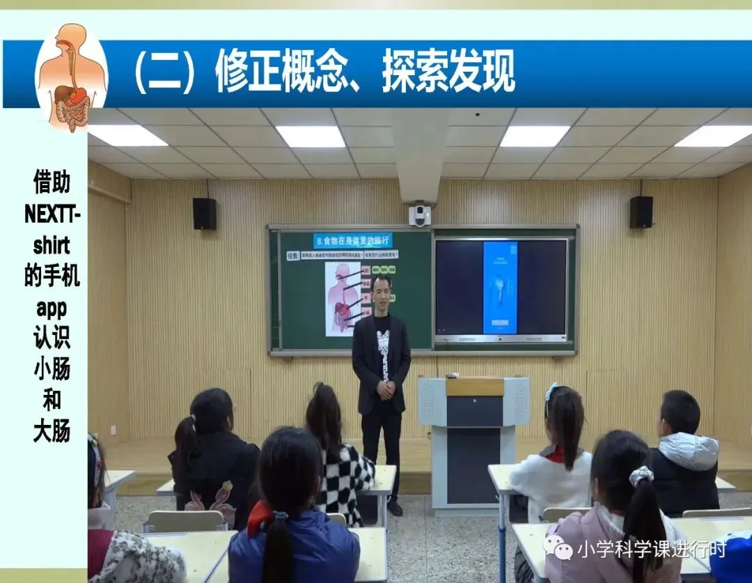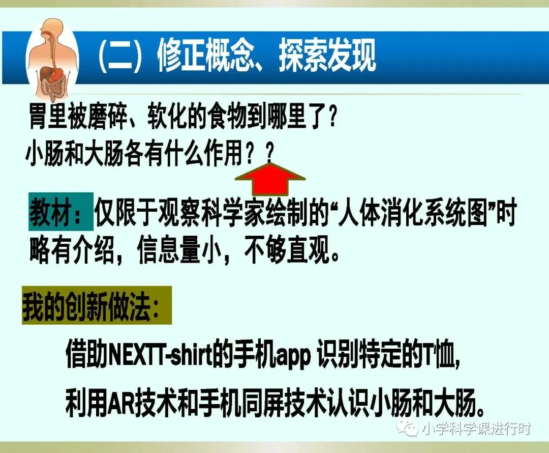 借助NEXTT-shirt的手机app 识别特定的T恤, 利用AR技术和手机同屏技术增强现实功能,认识小肠和大肠。新技术的运用增强了课堂的趣味性、学生的体验性。教学效果事半功倍。