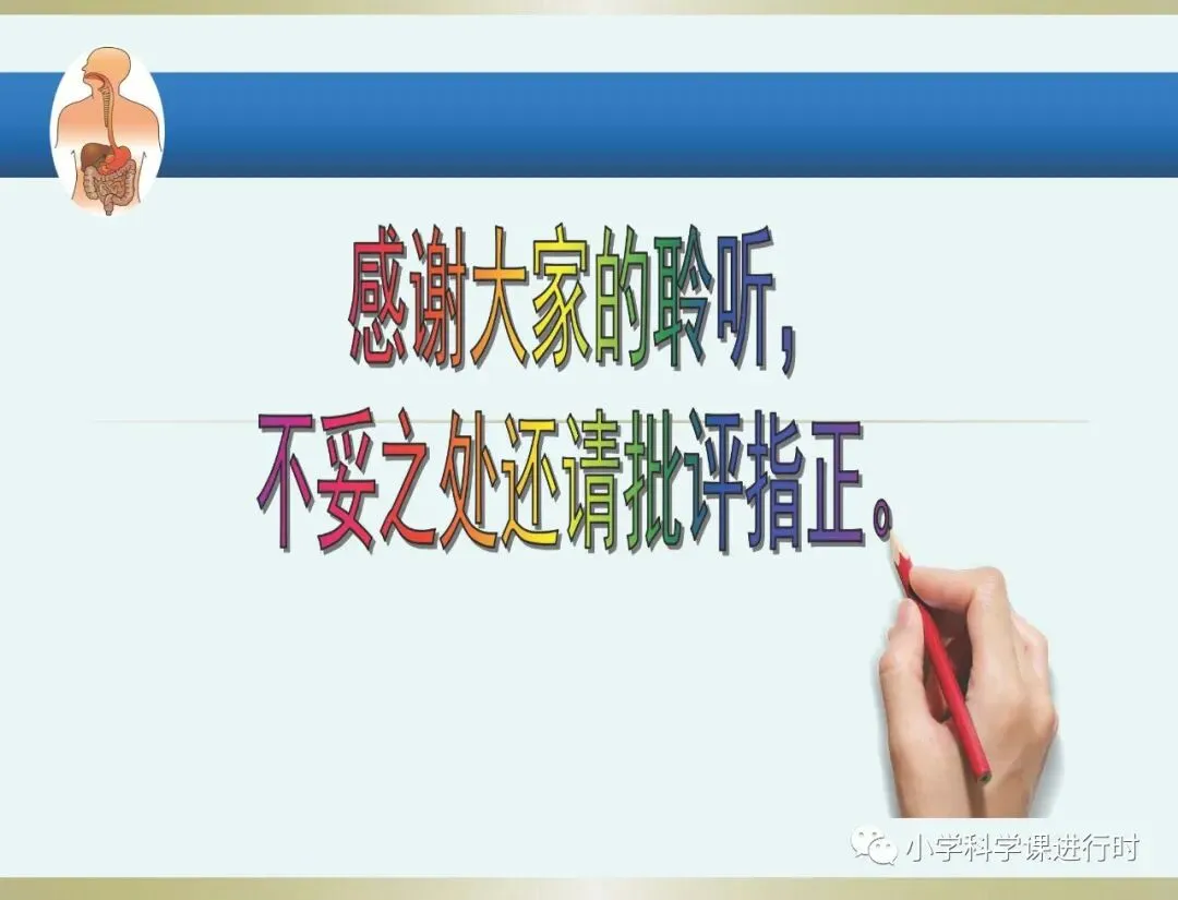 科学探究是没有止境的,今天的课虽然结束了,但是希望同学们不要停止探究的脚步,课下继续关注消化器官、关注饮食与健康,做一个健康、快乐、好学的小学生。
