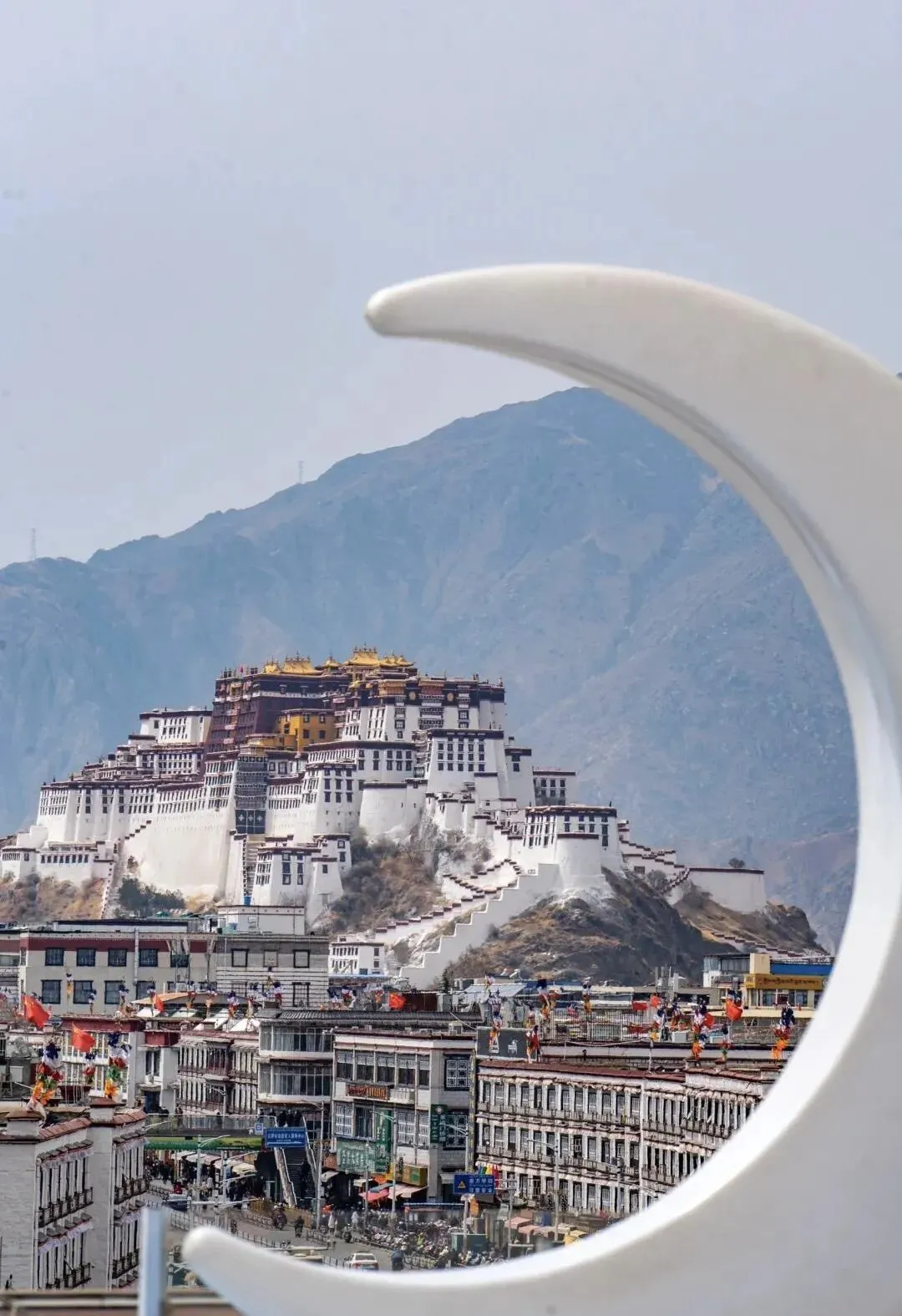 日出时,它被金光笼罩;日落时,它与晚霞同辉;夜晚灯火亮起,又温柔了整座拉萨城。