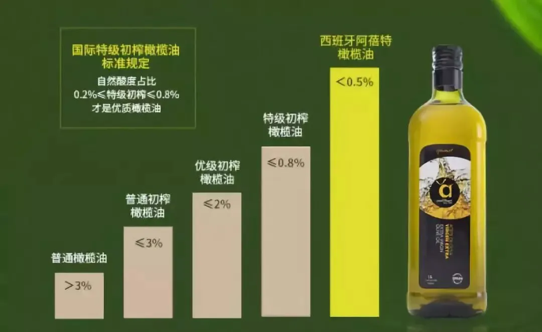 好的橄榄油不仅需要味道上佳,而且酸度也绝对不能超过0.8%,酸度越低说明橄榄油越新鲜,越好!