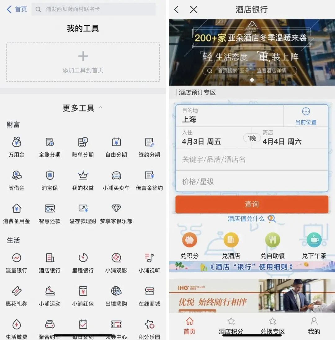 APP:持卡人进入浦大喜奔APP-生活-酒店“银行”