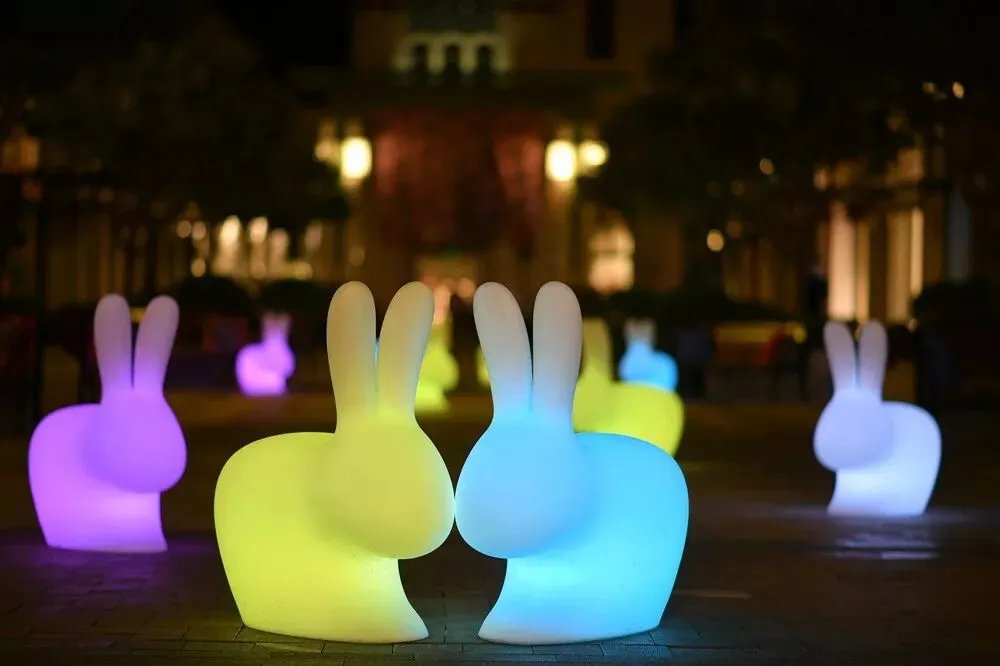 近千只火爆意大利的“夜光奇宝兔” 遍布苏州奕欧来园区的每一个角落 与身旁的欧式建筑相互映衬