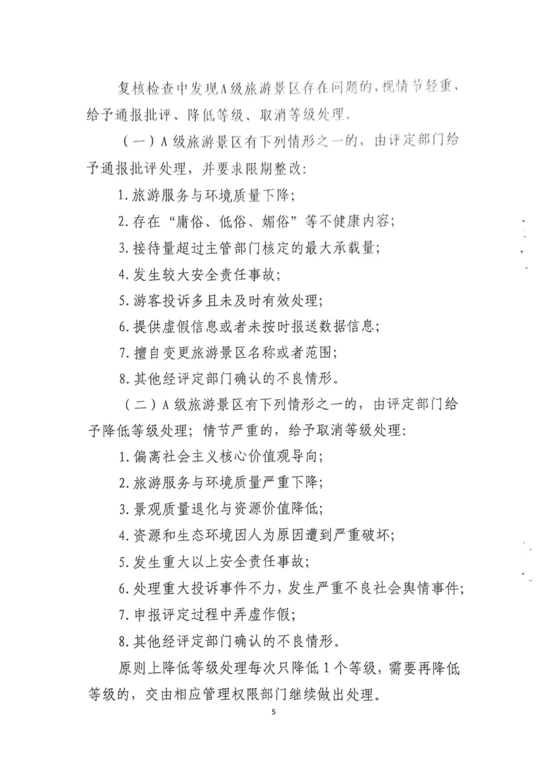 复核检查中发现A级旅游景区存在问题的,视情节轻重,给与通报批评、降低等级、取消等级处理。原则上降低等级处理每次只降低1个等级,需要再降低等级的,交由相应管理权限部门继续做出处理。除因不可抗力影响或资源保护需要外,A级旅游景区有终止经营、丧失旅游功能或停业1年以上情形的,原评定部门应当取消其质量等级。