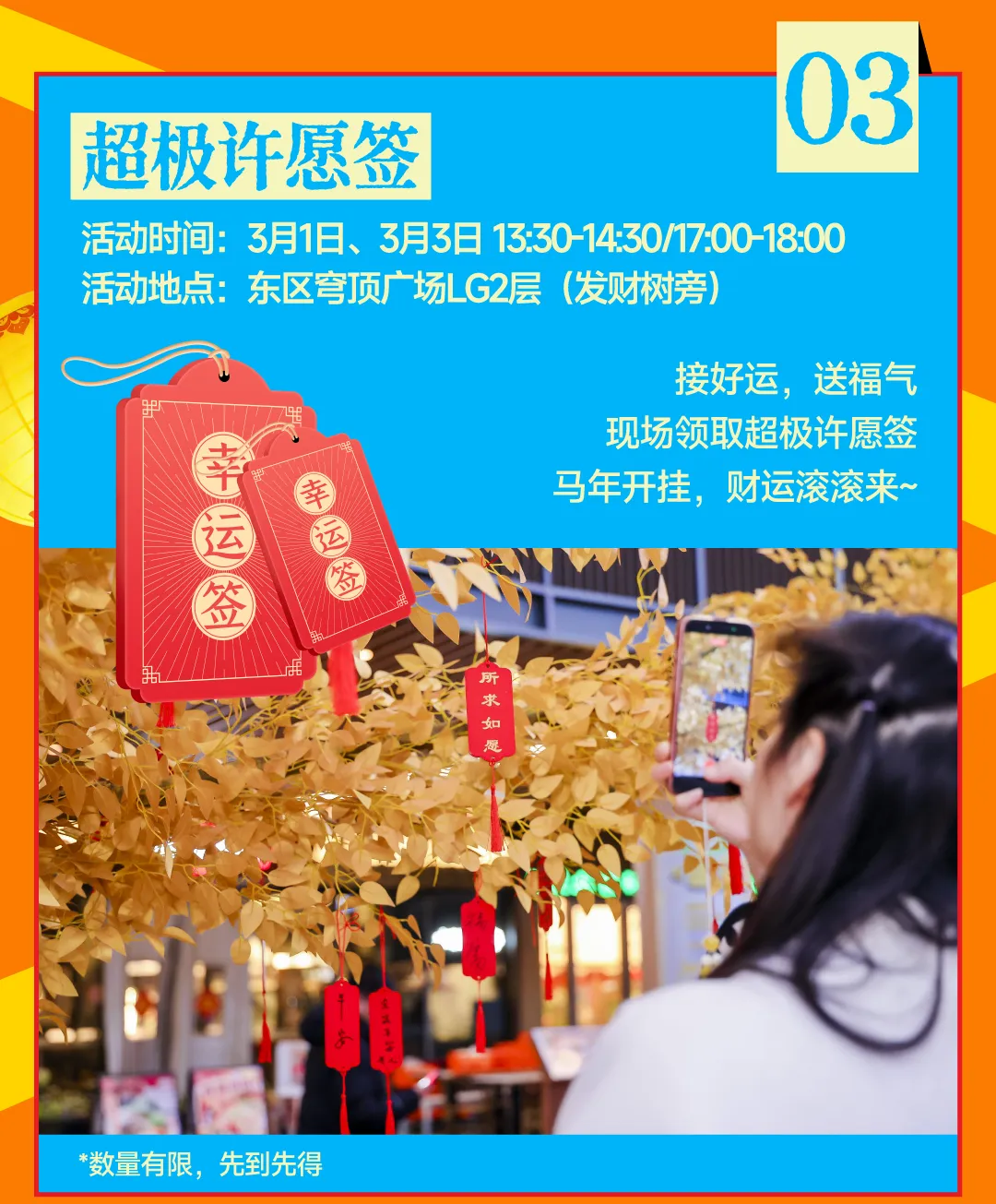 这里更有双重祈福等你解锁,在天灯上写下马年心愿,让光芒带你步步高升;或在发财树挂许愿签,沾喜气、迎财运,开启一年好运!