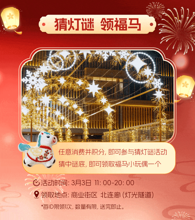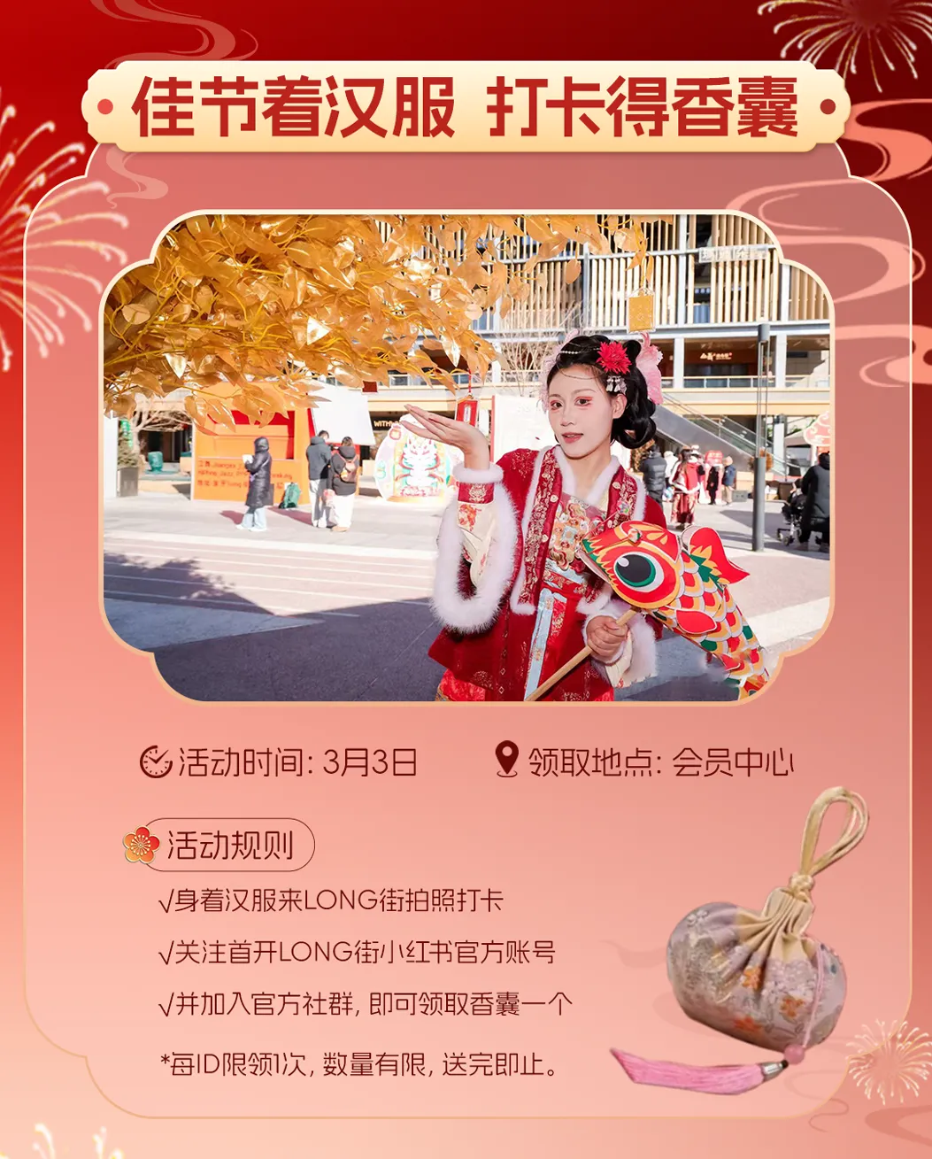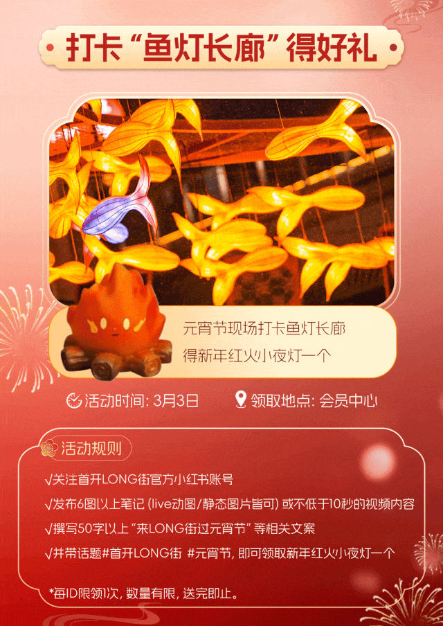 首开 LONG 街元宵国潮盛宴已上线!漫步璀璨鱼灯长廊,邂逅中式浪漫,打卡即领惊喜好礼;驻足灯谜墙破解谜题,赢马年限定福马,沾 “马到成功” 好运;汉服同好身着华服到场打卡,即可领取精美福袋,让国风仪式感拉满。