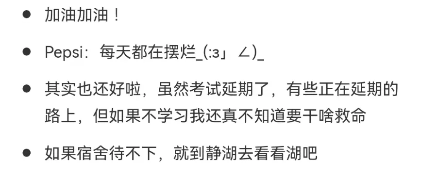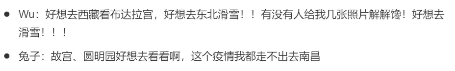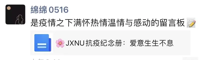 在春分这日,来自小青的小伙伴们发布了一份名为《🌸JXNU抗疫纪念册:爱意生生不息》的共享文档。截止3月23日12时,这份共享文档留言字数达4万多字,留言中占比最多的话题是“疫情散去,我想……”,其中有对疫情散去出门踏青的向往,有对家乡的思念,还有与念念不忘的TA重逢的期待……