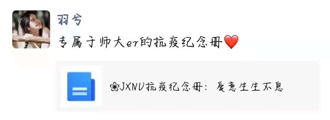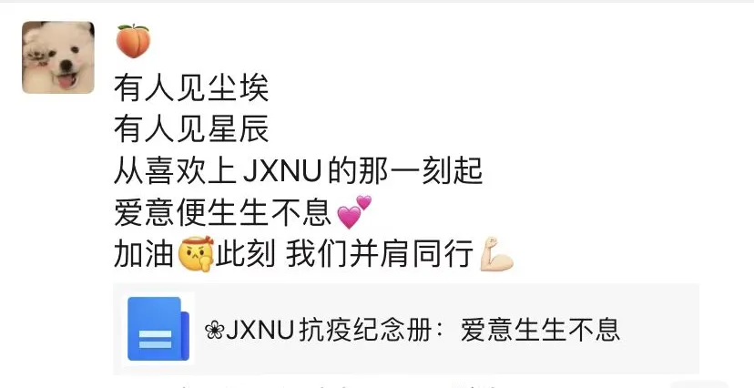 但同时我们发现,这场关于抗疫的故事属于医护人员,属于青年志愿者,更属于所有师大人及关注师大的每一个人。于是我们开始了《JXNU抗疫纪念册》的制作,这也是青春师大第一次以共同协作的方式尝试让每一位师大er成为发声的人和记录者。