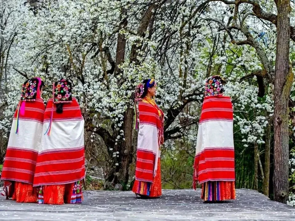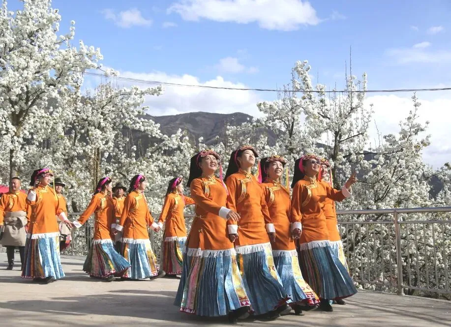 演员身着传统服饰,在梨花盛开的舞台上载歌载舞,展现浓郁的嘉绒藏族文化风情。