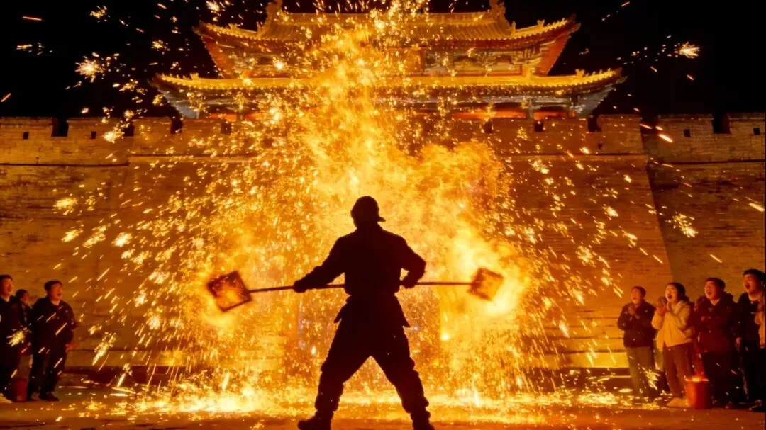 匠人们将1600多摄氏度的铁水泼洒向城墙,瞬间炸裂成万朵金花。