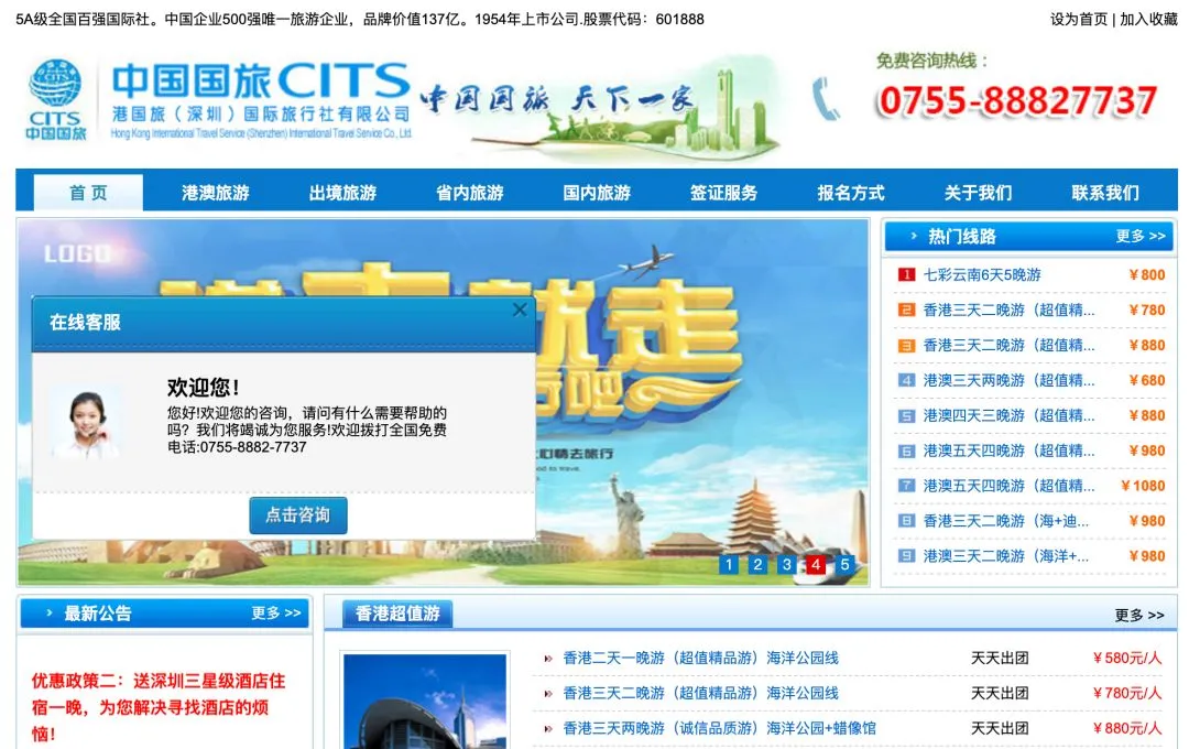 记者打开邢女士提供的这个网址为avcits.com网站,页面左上标注的“中国国旅CITS”的字样十分醒目。记者注意到,这家网站主要经营的是港澳游,页面最下方也清楚地标注着“中国国旅(深圳)旅行社官网”,地址为“深圳市罗湖区人民南路新安大厦”。