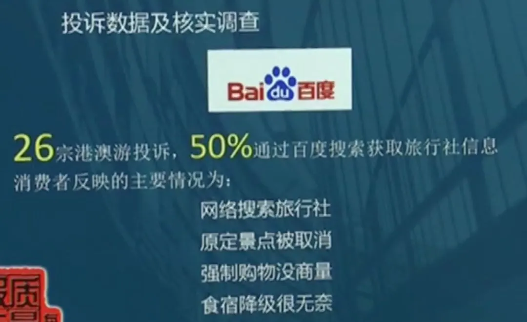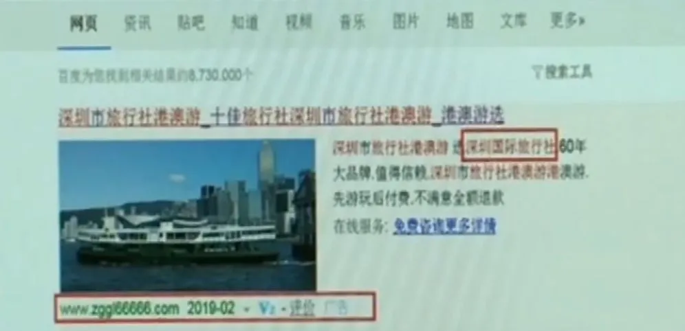 如今,很多人旅游都会选择在网上搜索旅行社信息,再报名参团,一些经过百度V认证的旅行社网站就成了消费者信赖的信息来源。但最近很多参加了“港澳游”的消费者反映,他们通过百度搜索并参团的旅行社,竟然是打着正规旅行社旗号的假冒旅行社,原本满心期待的开心之旅变成了“糟心游”。