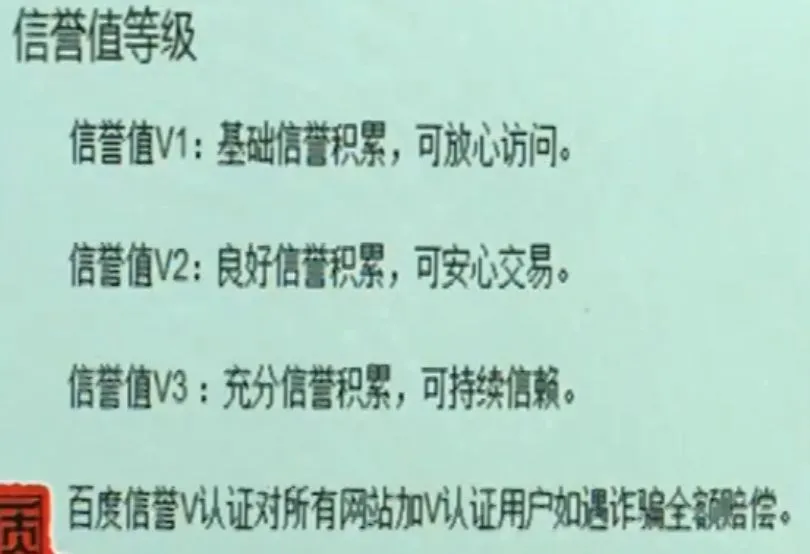 根据百度推广的宣传材料,百度信誉V认证,是百度通过对网站经营主体资质、网站安全性、网站权威性等核查后,在搜索结果中的商家官方网站标题右侧展现蓝色官网标识,以帮助网民快速识别权威优质网站,防止山寨网站、钓鱼虚假网站对网民的侵害。