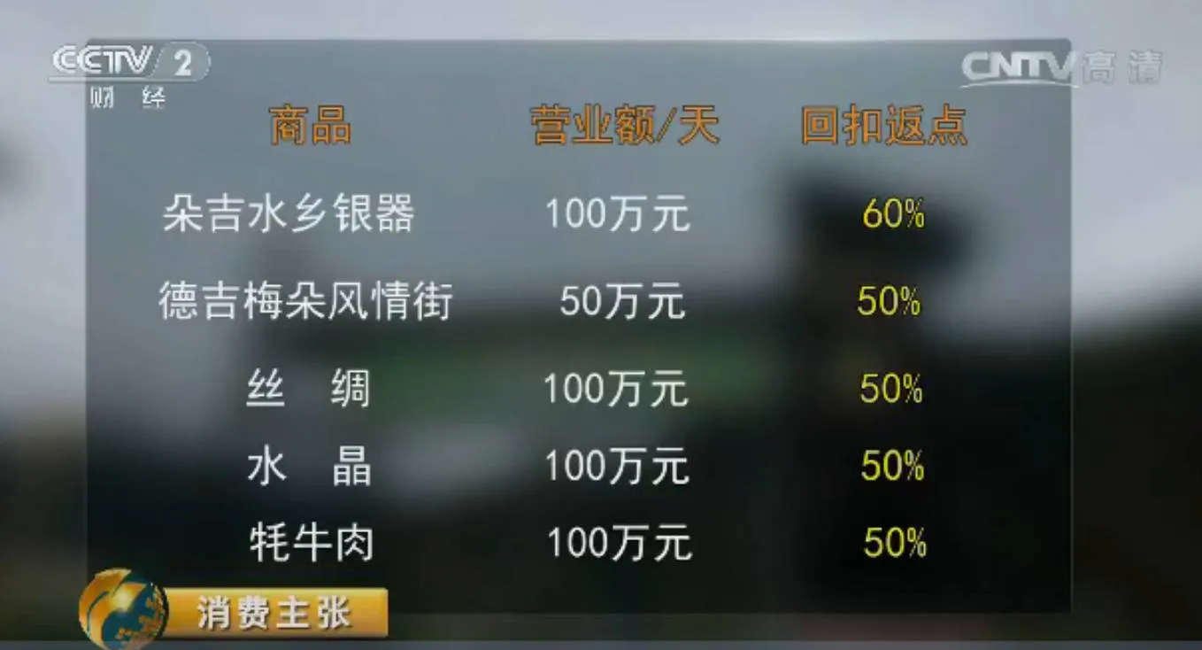 按照这份表格计算,朵吉水乡每天的营业额100万,返点60%,德吉梅朵风情街每天营业额50万元,返点50%,丝绸、水晶、牦牛肉等购物店每天营业额100万,返点50%。