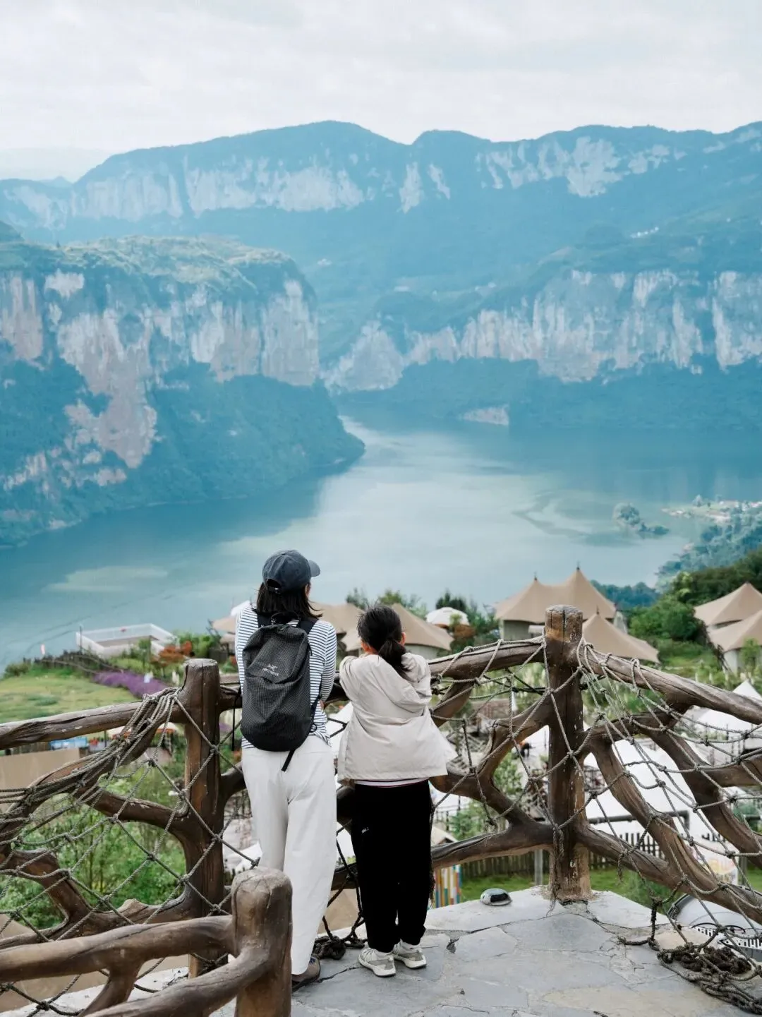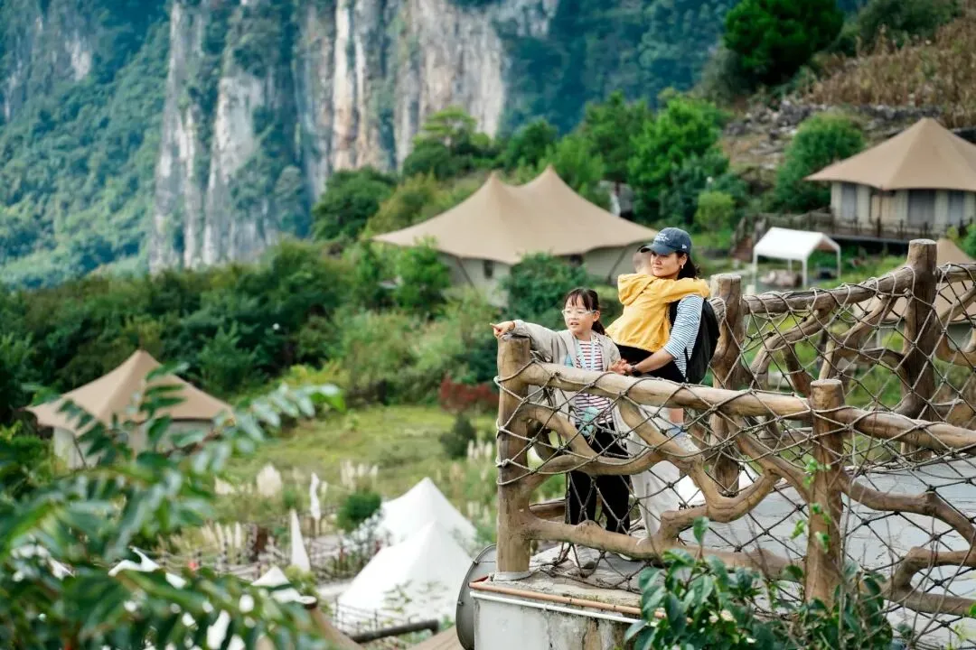 织金洞 离开贵阳后,第一站就是去乌江源化屋百里画廊和织金洞。 化屋百里画廊和织金洞都在毕节市,从贵阳出发,我们先去了乌江源,记得导航的点位是化屋百里画廊。时间差不多1个小时左右。在山顶有一个度假营地,我们停好车往那一站,一家三口嘴巴立刻张大,“嗷呜嗷呜”叫。(帽子发烧,在停车场旁边的椅子上躺着……)