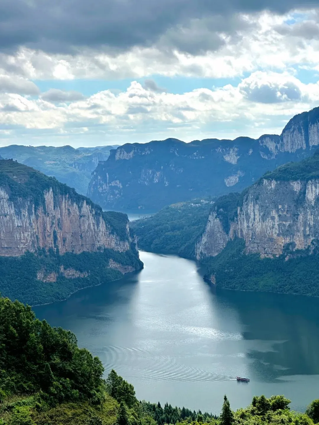 高山峡谷,红色的吊桥,在乌江源里游动的小小游艇。“头上天一线,峡中水一湾”,绝美的喀斯特山水地貌。