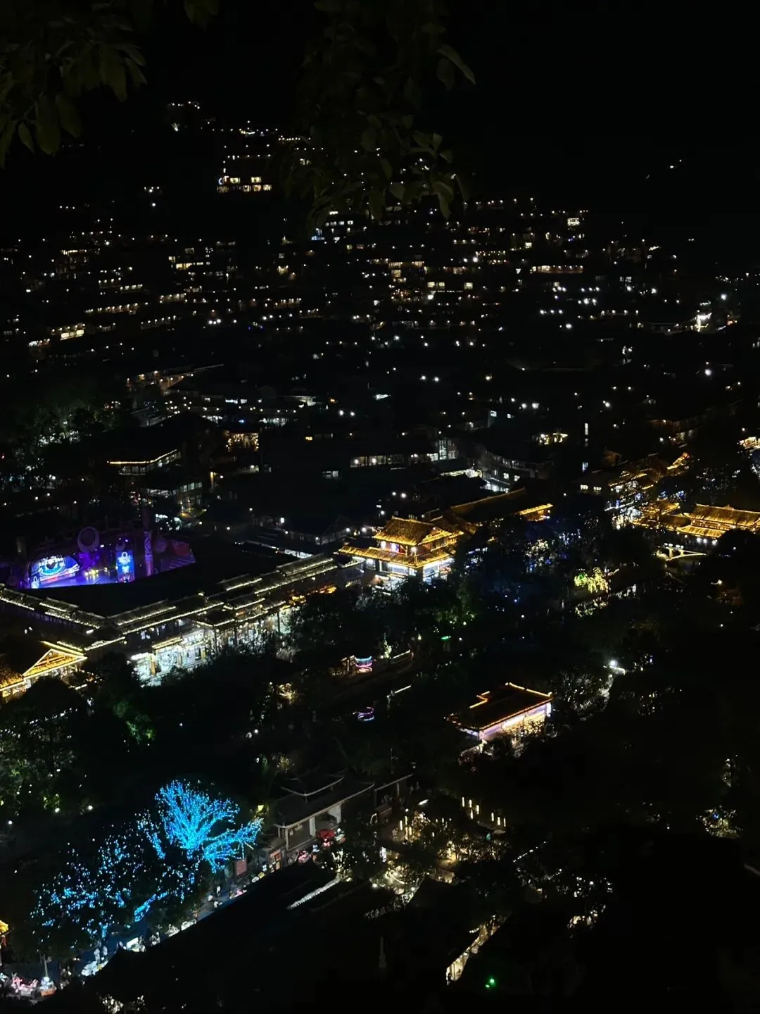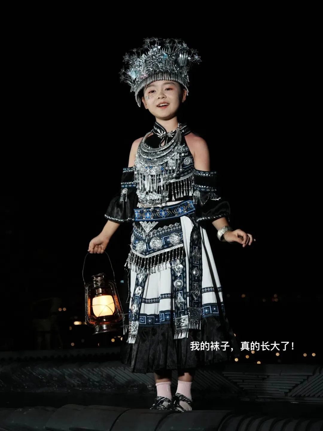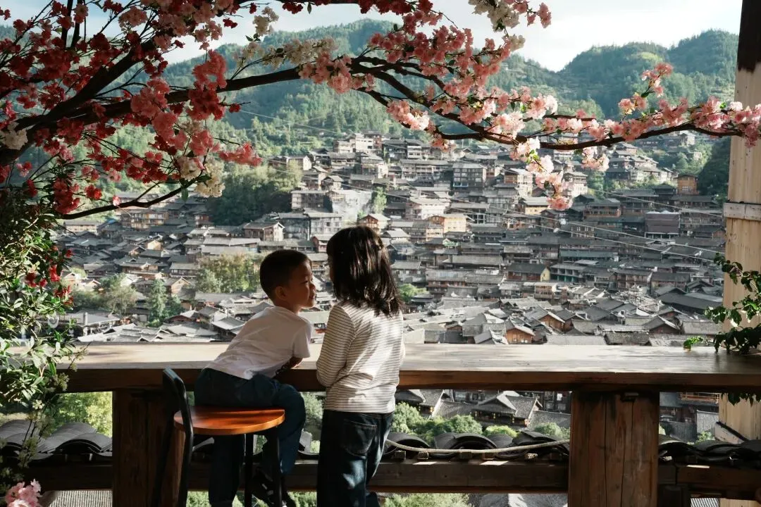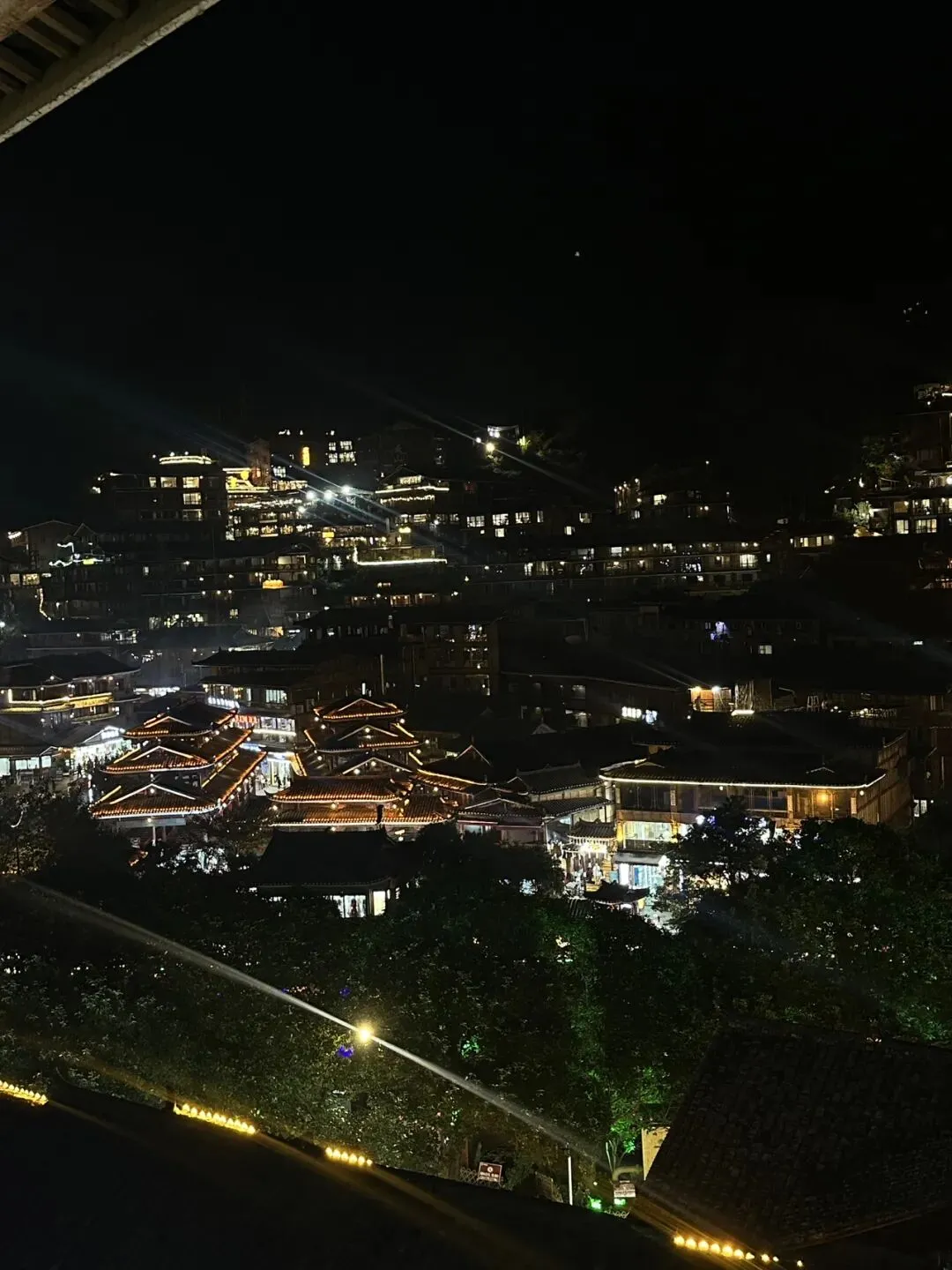 西江千户苗寨 我们到千户苗寨的时候,是晚上8点多,大家都很疲倦。 千户苗寨在黔东南,离荔波距离220多公里,开车需要3个小时。进入苗寨的路其实很好走。但因为国庆人流量大,在高速公路出口封闭,引导我们到了二十公里以外的另一个出口,然后再搬运行李坐景区的大巴车。 坐完大巴车到了景区门口,然后换小的通勤车进入景区。本来以为到了,还需要拖着行李走进去,换电瓶车。本来以为换了电瓶车到了客栈,发现还需要找客栈的人来驼行李上一百多个台阶。 摄影师的情绪稳定得像机器人一般,这会也有点跳脚了。孩子们也开始闹脾气。可等到真正进入苗寨里,看到不可思议的万千灯火,大家都不说话了。