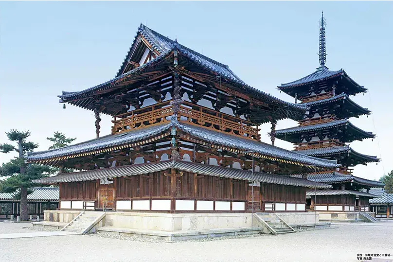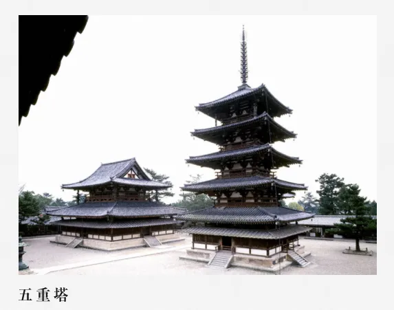 法隆寺是7世纪初年由日本佛教僧侣所建,建于日本国当年的首都一奈良城附近,是木结构建筑,寺的立体部分是进了南大门之后的一个迴廊围成的方形院子,南迴廊的正中设中门,中门之内有金堂和五重塔,分别布置在中轴线的东西两侧,讲堂设在北廊之外,钟楼和经藏在它的前侧。这种布局方式,日本叫做 “百济式”。法隆寺初建于中国的隋代,约公元607年。因而它的金堂和塔可反映中国南北朝时期的木构建筑,可惜该寺的金堂、塔、中门和廊的一部分在公元708年毁于一场火灾,重建以后,不幸于19年又罹火灾。所以尽管火灾幸留的木柱上标注着公元670年,实质上已是1949年后所建,多次遭灾重修,很可能已非当年原形。