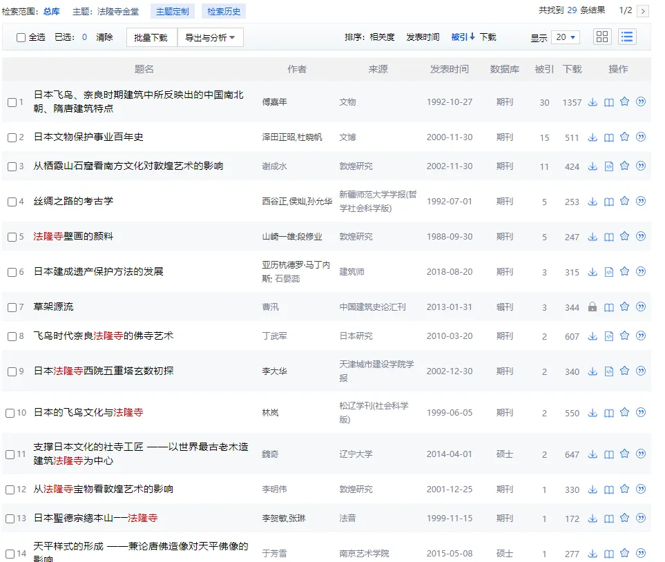 论文倒是很容易搜集,在知网以法隆寺为关键词进行搜索,再按照被引量进行排名,很容易就得到了如下结果。