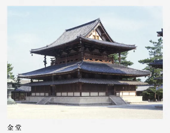 金堂:即佛殿。在西院庭院中偏东,和西面的五重塔并列。 金堂是全木构建筑,两层。 下层面阔五间,进深四间,分内外槽,外槽为迥廊,内槽供佛像。 上层面阔四间,进深三间,分别比下层减去一间,上下层柱不对位。 上层无楼板,不能登上。 傅熹年.日本飞鸟-奈良时期建筑中所反映出的中国南北朝-隋唐建筑特点 1992.10