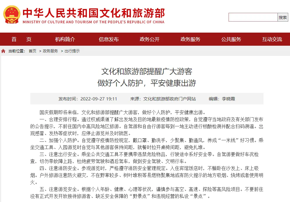 国庆假期来临,文化和旅游部提醒广大游客,做好个人防护,平安健康出游。