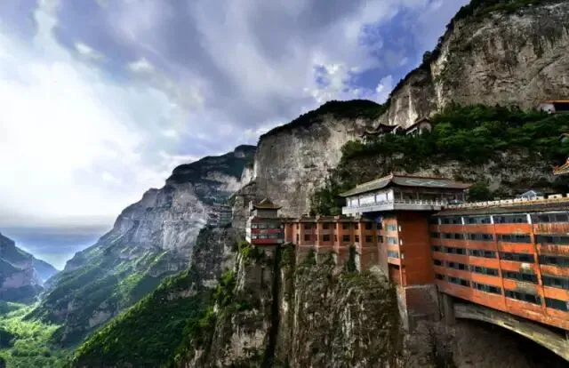 恒山悬空寺悬挂在北岳恒山金龙峡西侧翠屏峰的半崖峭壁间,像一个铤而走险的登山者,是国内现存的唯一的佛、道、儒三教合一的独特寺庙。