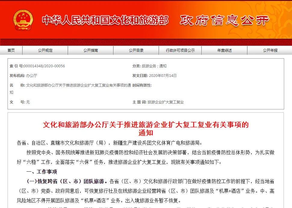(二)坚持有序恢复。各省(区、市)文化和旅游行政部门在做好疫情防控工作的前提下,经当地省(区、市)党委、政府同意后,可恢复旅行社及在线旅游企业经营跨省(区、市)团队旅游及“机票+酒店”业务。中、高风险地区不得开展团队旅游及“机票+酒店”业务。出入境旅游业务暂不恢复。
