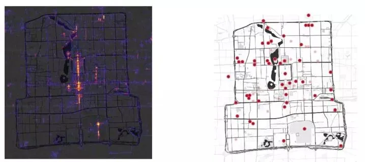 ▲左图:大数据统计下二环内北京景点拍照密度地图(from sightsmap);右图二环内国保单位分布图(浅色为不对外开放)。可以很容易看出景点热度与国保单位之间的正相关关系。