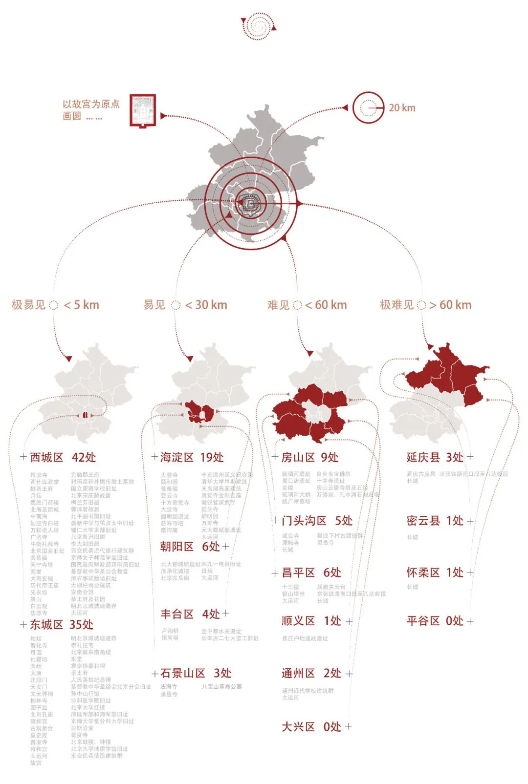 不知道大家发现没有,旅游名胜中文化遗产十有八九。 一来因为文化遗产本身作为历史财富留存至今有着各方面重要的意义,我们姑且称为核心价值; 二来因为其在历史长河中不断迭代累计的传播能量,大约相当于文化品牌。 遗产的价值加上品牌共同形成了文化软实力,进而强化了旅游地的吸引力。恰如我们去别家做客,主人总会首先给我们看看装修视野,看看字画花鸟而不是看厨房多大,结构多强。因为前者是文化软实力,更吸引人;而后者是民生基础,更多地隐藏在后面。 对于城市也是这样的道理,所以我们去杭州会去西湖而不是阿里巴巴,到了北京,当然是去看故宫而不是去百度。 在这样的基础上。我们认为,城市里的文化遗产是其吸引游客的重要要素。为了给大家更好地了解与推荐北京的旅游目的地,我们对北京的126处全国重点文物保护单位(为分析方便,我们把各段长城合并为一个,综合总共有125项)进行了各方面的对比,期望你来帝都旅游之际,有所帮助。 国保在哪? 难见指数 (图片点击放大)