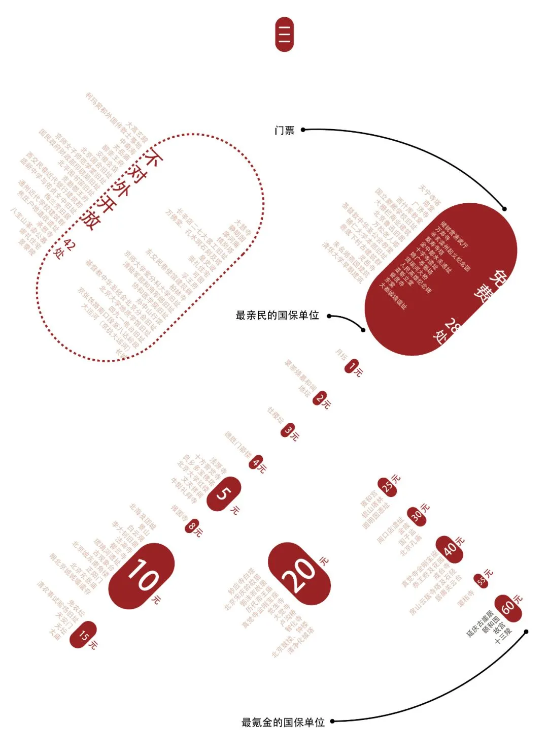 北京是一个以故宫为中心向外摊开环线规划的城市。所以我们以故宫为圆心画圆,每10km为一个单位定位各区的大概位置。越接近圆心的区域越容易到达,也就是更容易见到;反之,就是极难见的国保单位。 可以很明显看出,二环内的两个区(东城区,西城区)半径5km内的区域,拥有了绝大多数的国保单位。次圈层的四个区里,海淀区拥有国保单位较多。再外围的六个区里,房山区位列第一,拥有9处国保,大兴区没有一处。 而最外圈的四个区县的三个国保堪称帝都最难见的到国保单位,它们是:延庆古崖居,京张铁路部分段及长城部分段。 所以,如果你来北京旅游看名胜古迹, 请选择住在二环内! 请选择住在二环内! 请选择住在二环内! 重要的事讲三遍!!! 门票多贵? 氪金指数 (图片点击放大)