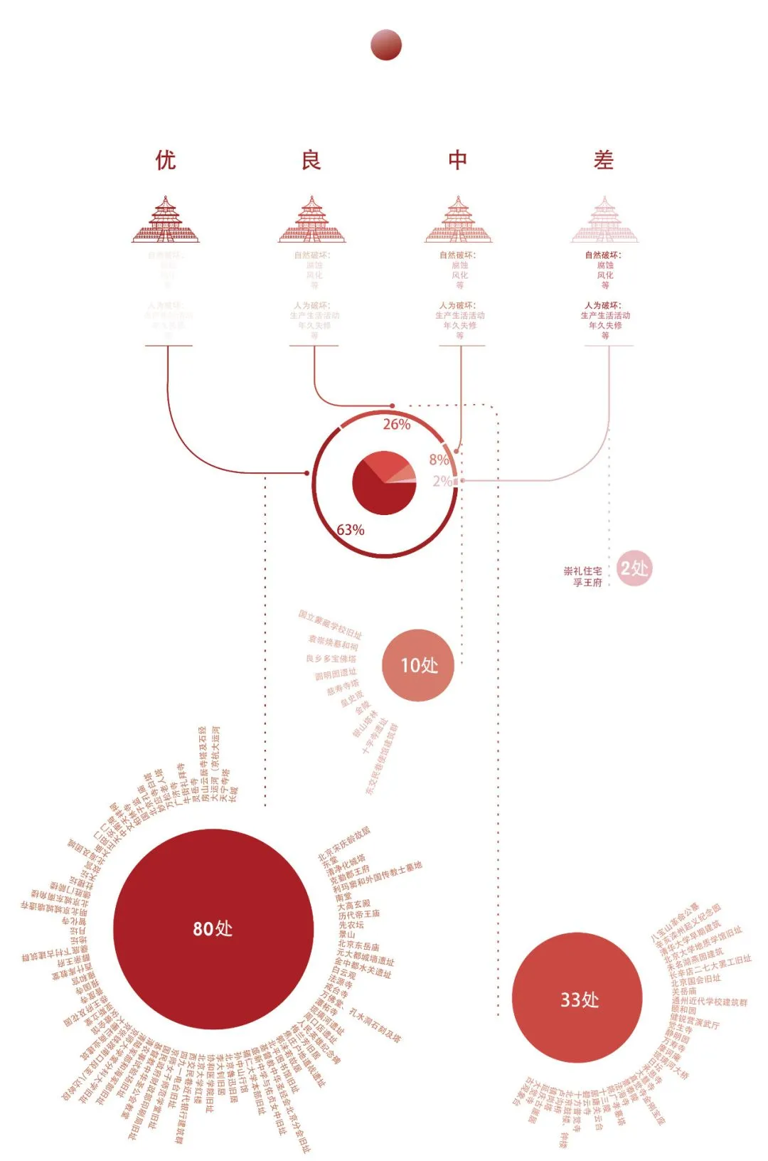 所谓完美,我们以遗产保护状态为标准进行评估。大部分国保单位保存状况都比较良好,少部分国保单位由于所属问题而缺少维护跟修缮,现保存状态较差的单位有两个:崇礼住宅及孚王府。