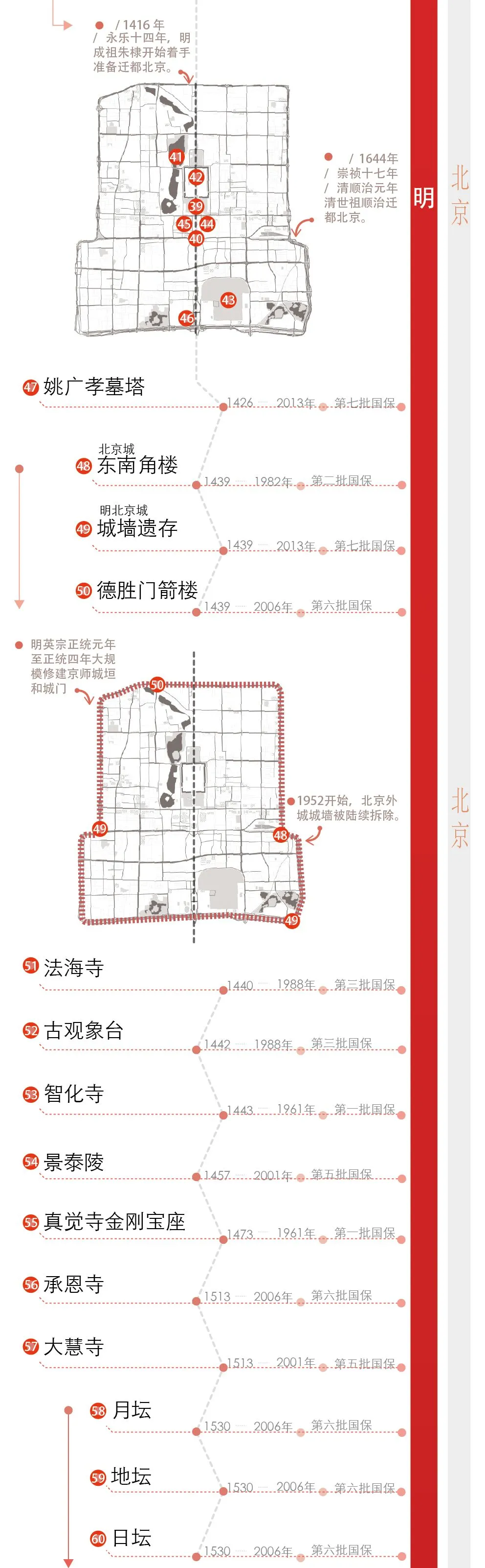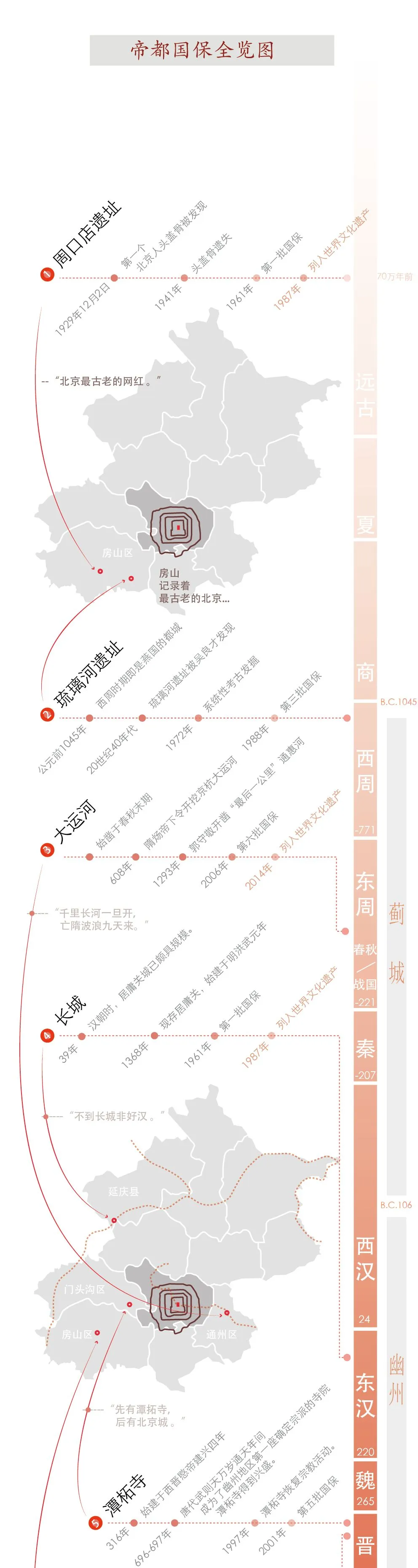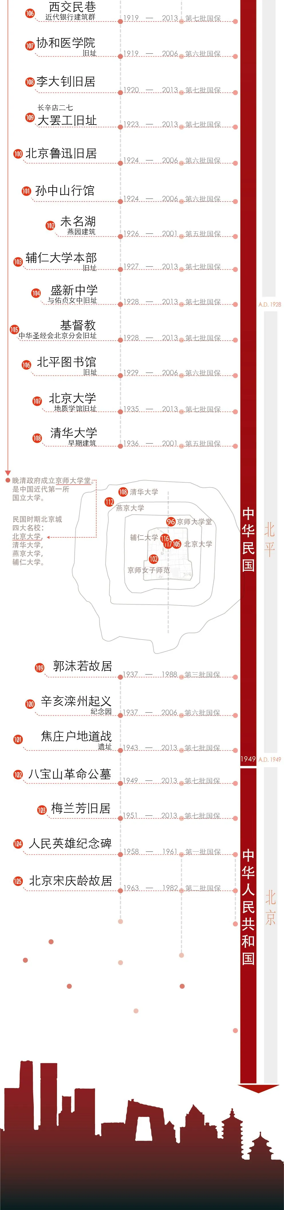 国保从哪来? 国保全览 最后的最后,我们对帝都的126处国保(为分析方便,我们把各段长城合并为一个,综合总共有125项)按时间朝代进行了梳理 — 从70万年前的周口店遗址到1962年宋庆龄女士在周总理安排下住进西城区的四合院 —这个跨越万年的历程表即是北京深厚的文化历史见证,亦是每年千万游客到访帝都的动机。以信息图绘的方式展示,也是希望大众更好的了解我们的历史,我们从何而来,因为“ 我是谁?我从哪来?我要到哪去?”自古都是个值得深究的问题。 (图片点击放大)