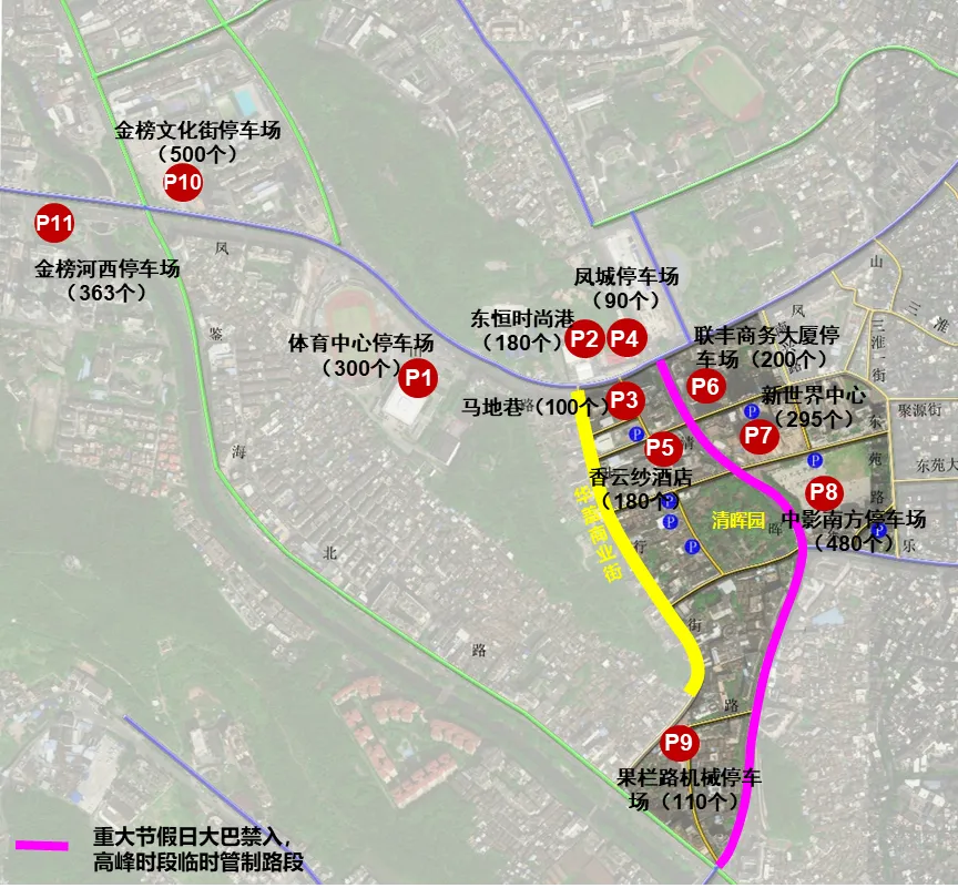 五一期间清晖园片区通行规定及停车场分布情况示意图