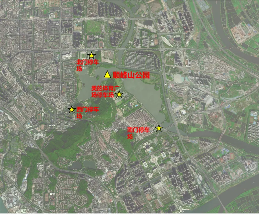 (1)顺峰山公园共开放北门停车场、西门停车场、南门停车场、美的体育广场停车场,共约2000个停车位。