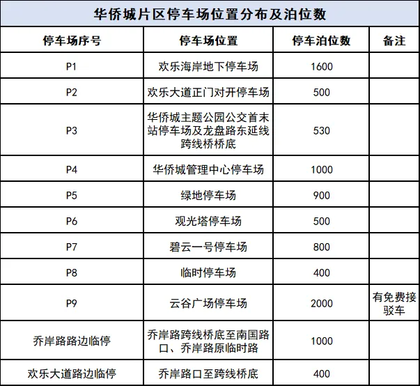 (1)五一假期期间,华侨城提供停车场9个,并新增临时停车位,开放乔岸路(乔岸路跨线桥底至南国路口)、乔岸路原临时路、欢乐大道(乔岸路口至跨线桥底)等部分道路路段两侧供车辆临时停放,共约提供停车泊位约9630个。