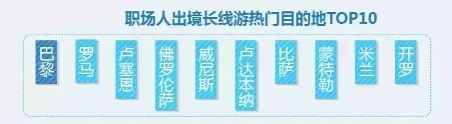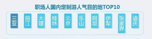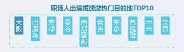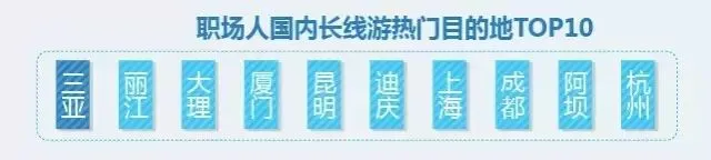 在热门目的地选择上,职场人周边游热门目的地前十名分别为杭州、北京、宁波、重庆、嘉兴、舟山、黄山、上海、苏州、西安;国内长线游热门目的地前十名包括三亚、丽江、大理、厦门、昆明、迪庆、上海、成都、阿坝、杭州;出境短线游热门目的地前十名有大阪、巴厘岛、京都、曼谷、南都留郡、普吉、东京、芭提雅、甲米、奈良;出境长线游热门目的地前十名包括巴黎、罗马、卢塞恩、佛罗伦萨、威尼斯、卢达本纳、比萨、蒙特勒、米兰、开罗。