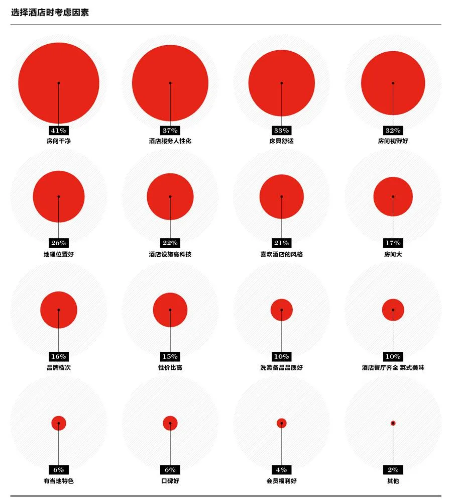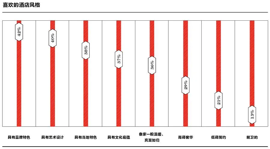 5 选择酒店的考虑较多 年轻一代高端旅游者选择酒店时的考虑因素首先是房间状况,其次是服务人性化(37%)、地理位置好(26%)、设施高科技(22%)和喜欢的酒店风格(21%)。他们期望奢华酒店的房间能够在设施和设计的细节方面提供更高品质的住宿体验。他们喜欢管家式和电子化互动式服务,期待体贴入微的个性化服务,同时也不希望被过于殷勤的服务打扰。他们青睐酒店能够提供高科技数字化设备,如无线WiFi(73%)、智能电视(55%)等,不仅有新鲜有趣的入住体验,同时可以增加温馨感、个性化和便捷度。他们偏好有品牌特色和艺术设计的酒店风格,以增加旅途中“与众不同”和“趣味体验”的满足感。