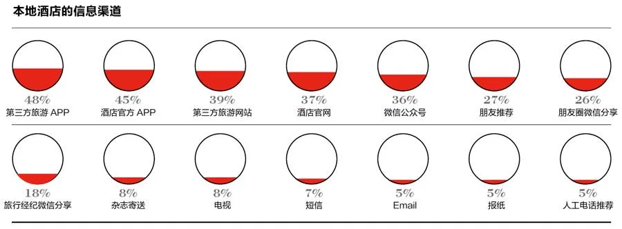 6 国航、汉莎航空分别成为最青睐的国内、国外航空公司 在年轻一代高端旅游者常用的航空选择上,国航以绝对优势排名第一(51%),其次是南航和东航。国外航空公司中,由于年轻一代高端旅游者的首要目的地是欧洲,汉莎航空因其拥有航线多、中转方便等优势排名第一(19%)。相比之下,年轻一代对酒店的会员计划关注度不高,其中香格里拉贵宾金环会的会员青睐度最高。 7 微信、第三方旅游APP成为主要旅游信息渠道 年轻一代高端旅游者获取旅游信息的主要来源是微信公众号(48%)、朋友圈微信分享(47%)和网站(42%)。微信成为首要消息来源,年轻旅游者通过微信公众号、朋友及旅行顾问在微信上分享等多个途径了解旅游资讯。第三方APP也成为重要信息源:如携程、去哪儿和途牛是常用软件。