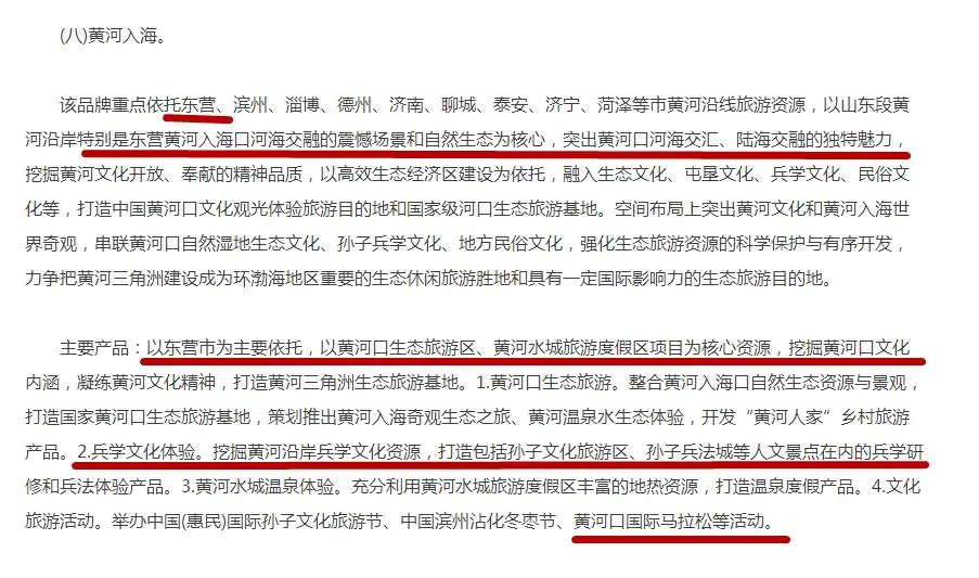 主要产品:以东营市为主要依托,以黄河口生态旅游区、黄河水城旅游度假区项目为核心资源,挖掘黄河口文化内涵,凝练黄河文化精神,打造黄河三角洲生态旅游基地。1.黄河口生态旅游。整合黄河入海口自然生态资源与景观,打造国家黄河口生态旅游基地,策划推出黄河入海奇观生态之旅、黄河温泉水生态体验,开发“黄河人家”乡村旅游产品。2.兵学文化体验。挖掘黄河沿岸兵学文化资源,打造包括孙子文化旅游区、孙子兵法城等人文景点在内的兵学研修和兵法体验产品。3.黄河水城温泉体验。充分利用黄河水城旅游度假区丰富的地热资源,打造温泉度假产品。4.文化旅游活动。举办中国(惠民)国际孙子文化旅游节、中国滨州沾化冬枣节、黄河口国际马拉松等活动。