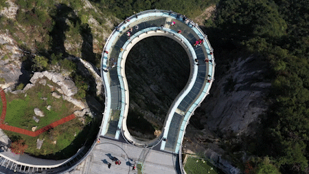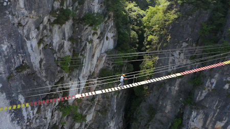 大秋千建在距离石笋河河面将近700米高的悬崖边,相当于233层的高楼,秋千一摆就是置身万丈深渊,真的很考胆量。