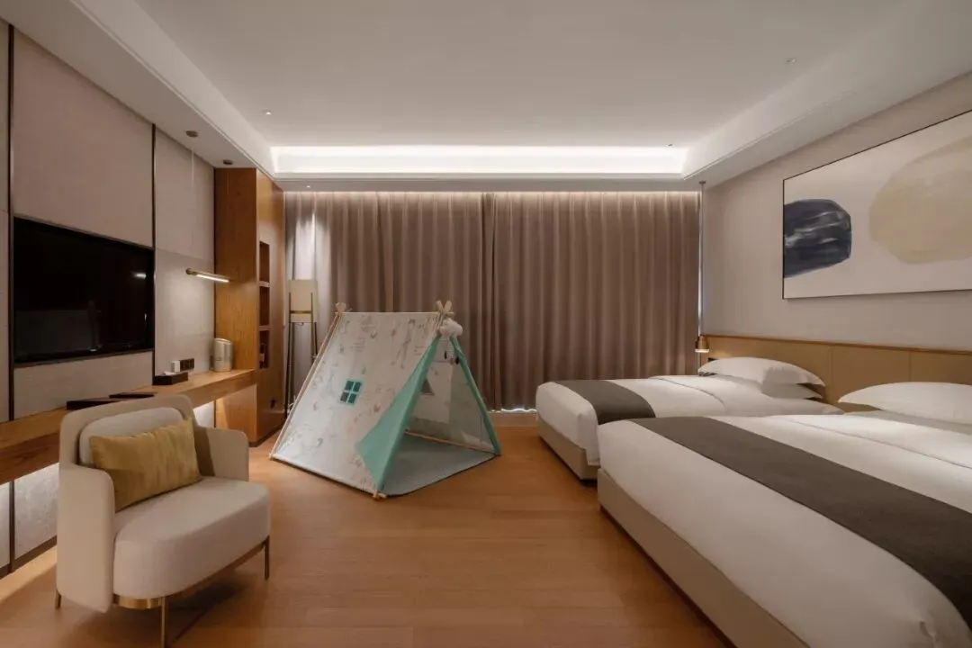如果是带小孩的家庭,40㎡的亲子套房也很合适,儿童洗漱用品、马桶便利凳、婴儿洗澡盆等儿童用品也是应有尽有。