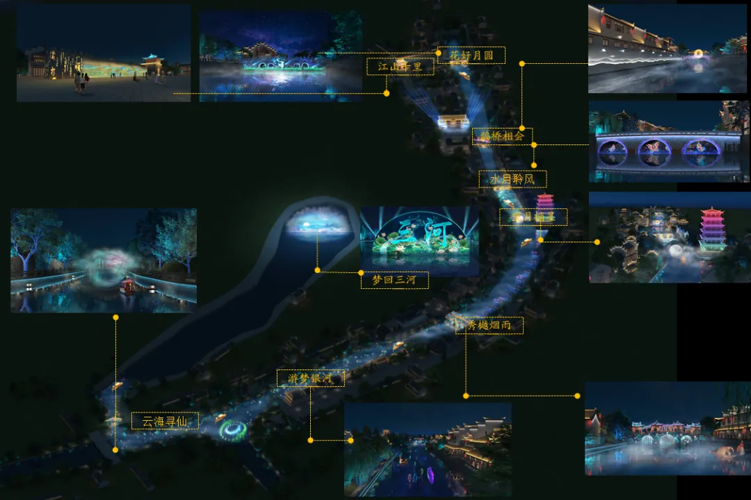 “三河明月夜”演绎故事按照先后顺序主要有九个故事内容分别是:云海寻仙(仙归桥)--梦游银河(小南河音乐喷泉)--秀越烟雨(对越桥)--望月摘星(望月桥)--水月聆风(三县桥)--鹊桥相会(鹊渚廊桥)--花好月圆(二龙桥)--江山千里(白墙河段)--梦回三河。